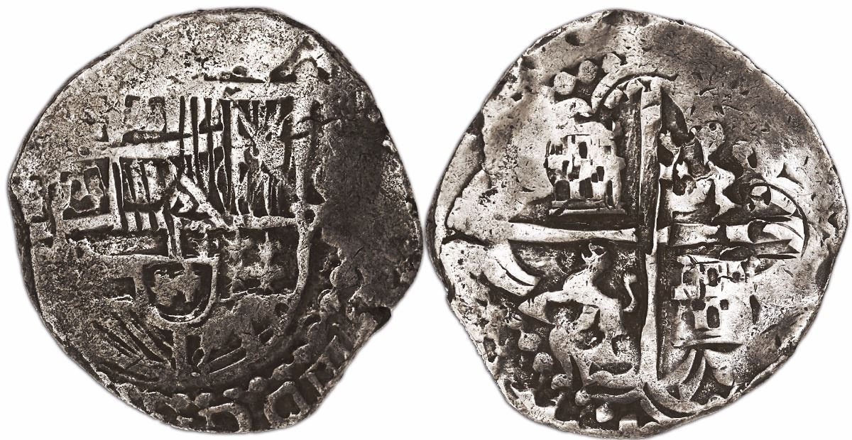 Potosi, Bolivia, cob 8 reales, Philip III, assayer not visible, Grade 1, with original tag but certificate missing. 27.12 grams. Bold full king's ordinal III in legend, full but slightly off-center shield, full but slightly doubled cross, nice toning, no corrosion. With Fisher tag #260315 and Historic Research and Certification replacement photo-certificate. Recovered from: Atocha, sunk in 1622 west of Key West, Florida