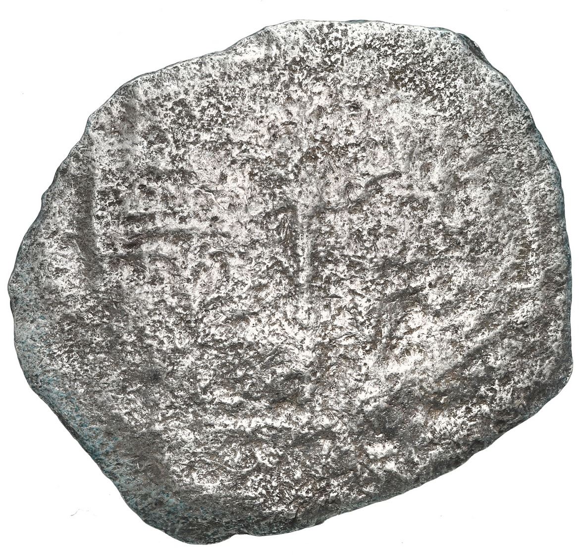 Potosi, Bolivia, cob 8 reales, Philip III, assayer not visible, Grade 4, ex-Sedwick Auction 1. KM-10. 9.10 grams. Very worn and thin from corrosion, most of cross and shield still discernible, lightly toned. With original Fisher tag and certificate 84-166 (assayer erroneously stated as T), pedigreed to Sedwick Auction 1, with original lot-tag 117. From: Santa Margarita, sunk in 1622 west of Key West, Florida