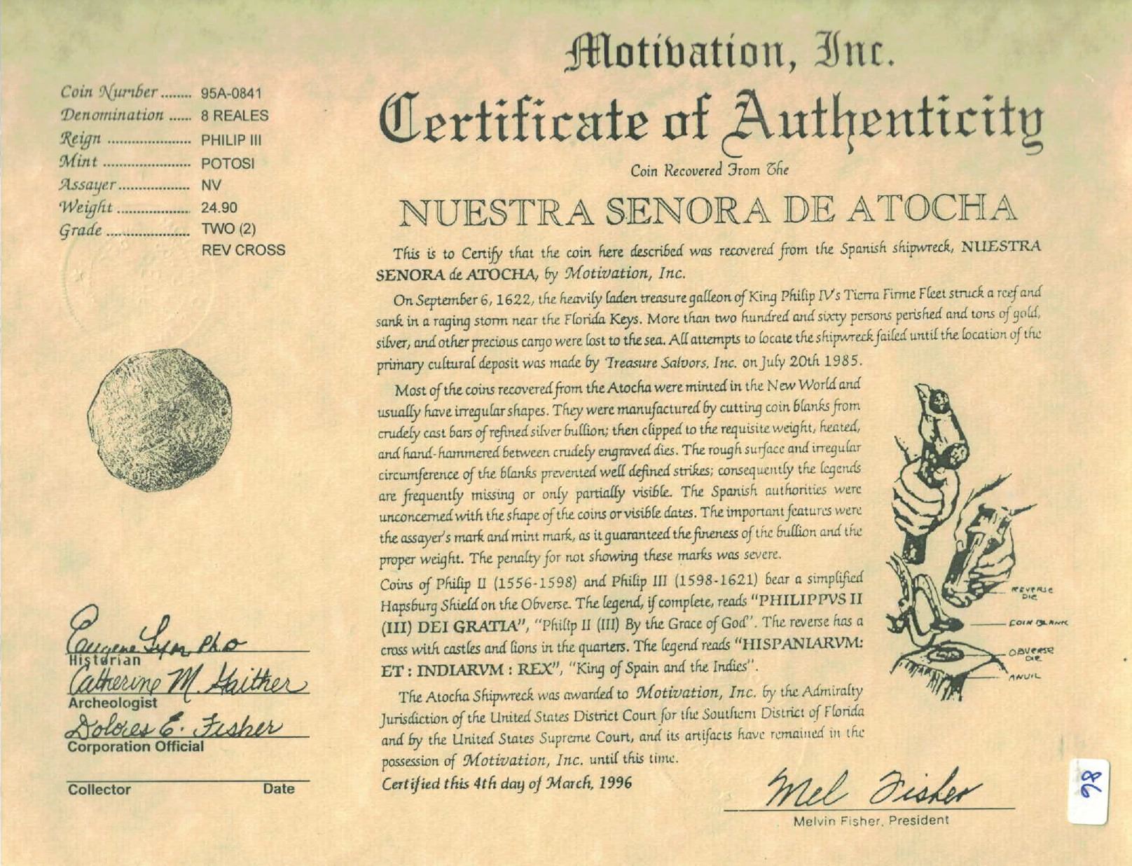 Potosi, Bolivia, cob 8 reales, Philip III, assayer not visible, quadrants of cross transposed, Grade 2. KM-10; Cal-Type 165. 24.88 grams. Solid flan despite surface corrosion with good full shield and cross. With Fisher tag and certificate #95A-0841.From: Atocha, sunk in 1622 west of Key West, Florida