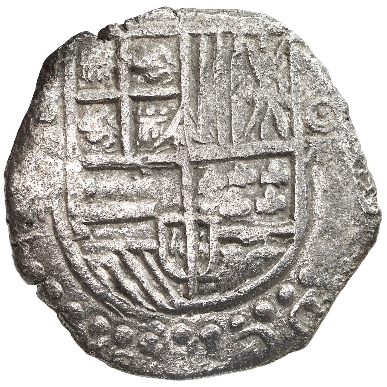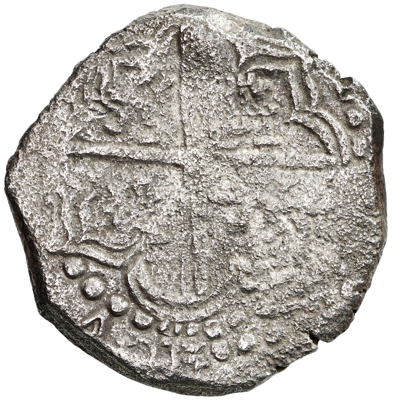 Potosi, Bolivia, cob 8 reales, Philip III, assayer not visible, quadrants of cross transposed, Grade 2. KM-10. 24.97 grams. Choice full shield, corroded cross, nice round flan, faintly toned. With original Fisher tag and certificate 85A-189110, pedigreed to the J.P. Silberman Estate.Recovered from: Atocha, sunk in 1622 west of Key West, Florida.