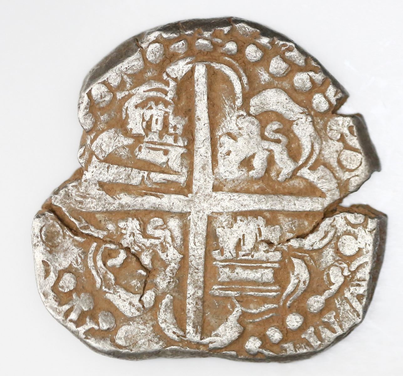 Potosi, Bolivia, cob 8 reales, Philip IV, assayer T (style of 1629), denomination "8," heavy-dot borders, ex-"Panama hoard." S-P26; KM-19a. 27.23 grams. Crude edge with cracks and void (as made), good full shield and cross and P-T, VF with heavy clay encrustation. From the ca.-1629 "Panama hoard."