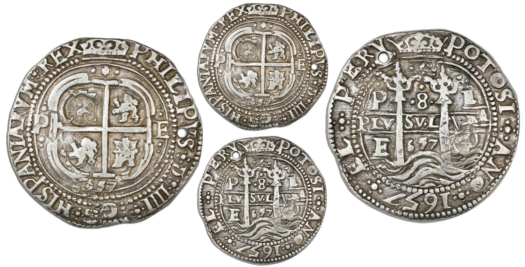 Potosi, Bolivia, cob 8 reales Royal (galano), 1657E, pomegranate at top on both sides, with Guatemala sun-over-mountains countermark (Type II, 1839) on cross, very rare. S-P37a; KM-R21; CT-419. 27.23 grams. Lovely XF, lightly toned, with 100% full details, including the countermark, tiny hole to right of cross, die-match with Lazaro #152 (rarity R2). Curiously, as is the case with this coin, most of the many different 1657s known (Lazaro shows seven) show an inner ring inside the border of dots on both sides, and it is one of only two dates in the 1600s (the other being 1666) to show the center date in three digits.