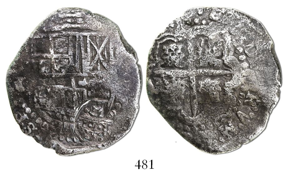 Potosi, Bolivia, cob 8 reales, assayer not visible, (O, 1649-50), crowned-F countermark on shield. S-P35; KM-19b. 20.75 grams. Crude from edge-corrosion but with full shield and cross, full countermark, patchy toning. Recovered from: Capitana, sunk in 1654 off Chanduy, Ecuador