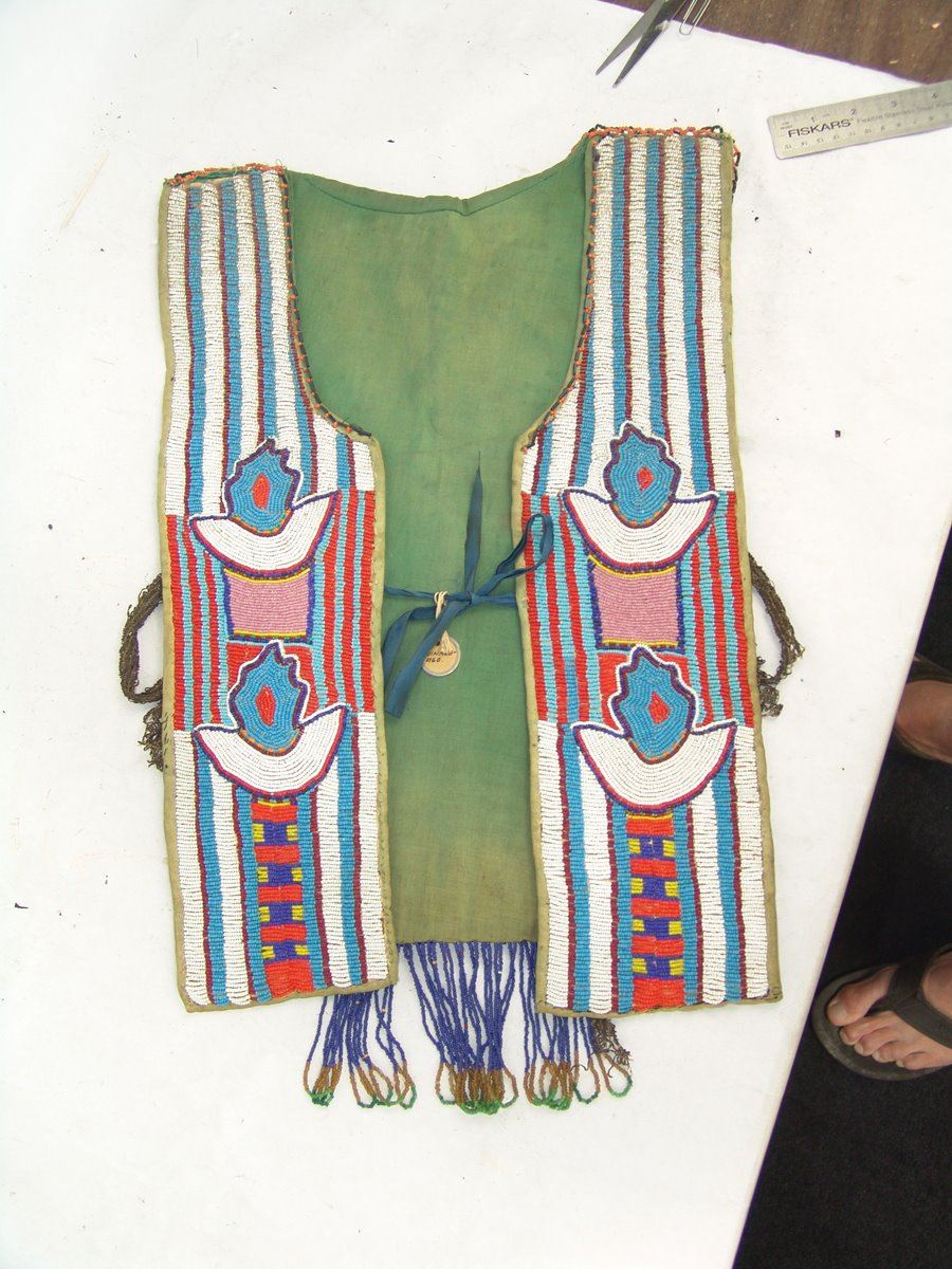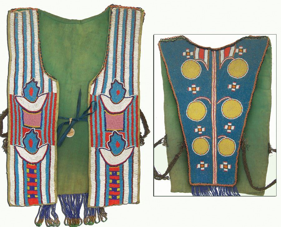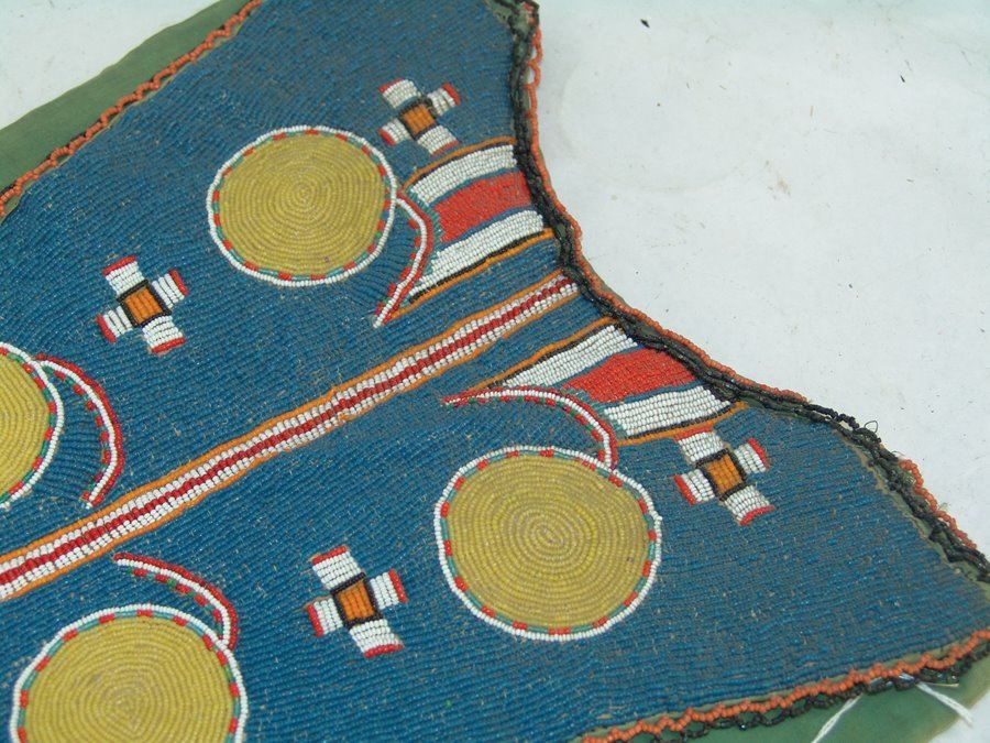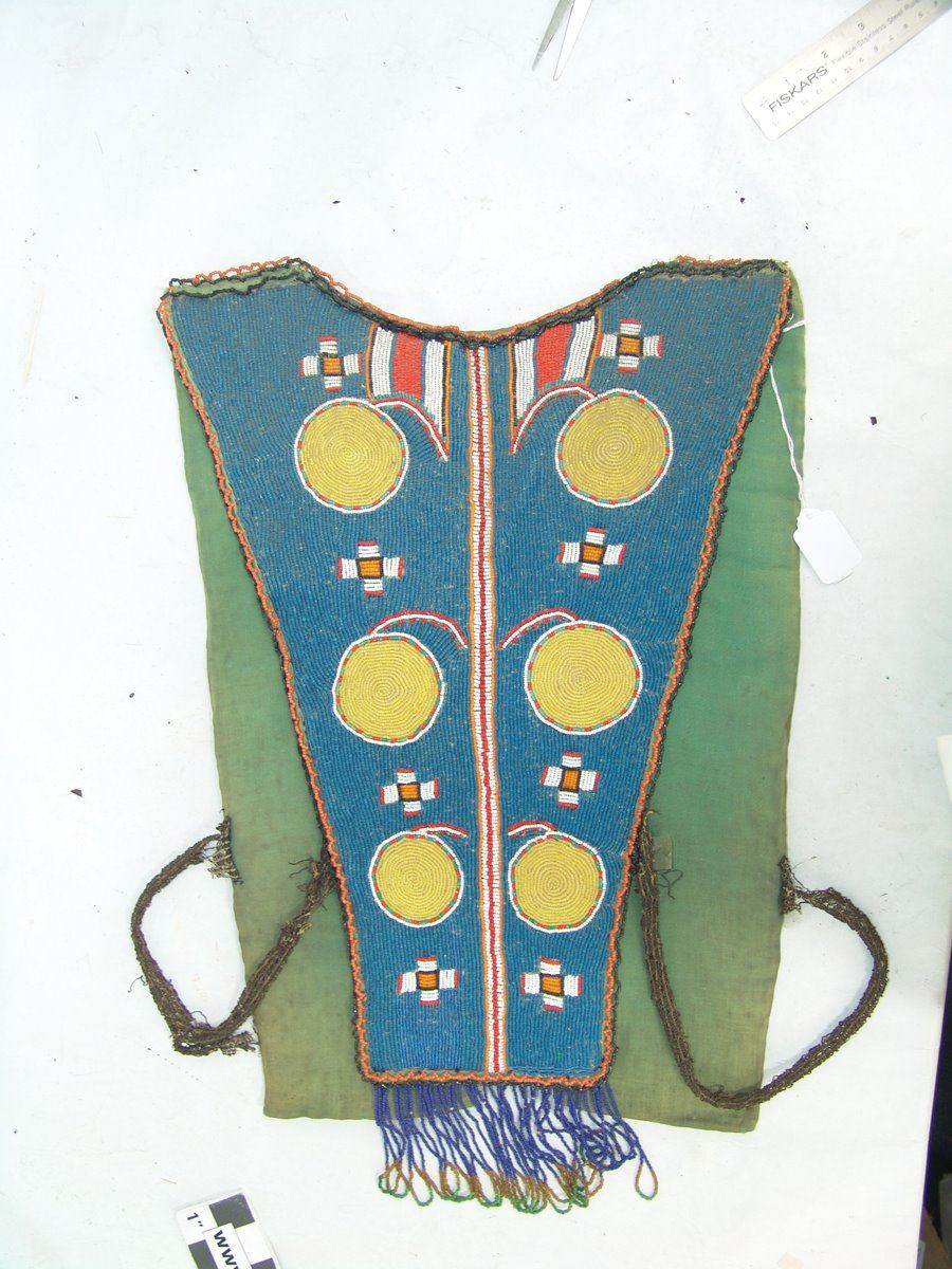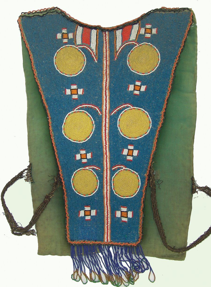 Rare Southern Plains lazy stitch and contour beaded men's throw over vest/yoke with interesting floral forms on front and round yellow circles (fruit ?) on the back. Good condition, minor bead loss. The only one,Early 1900s,20" x 13"