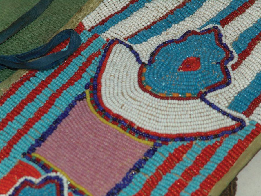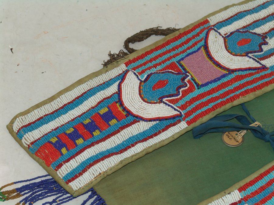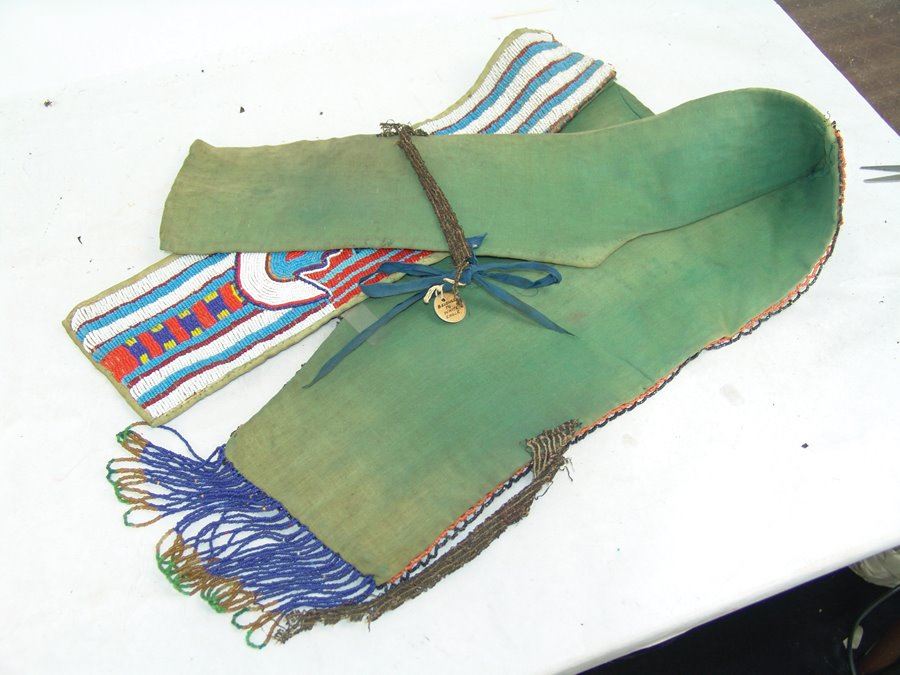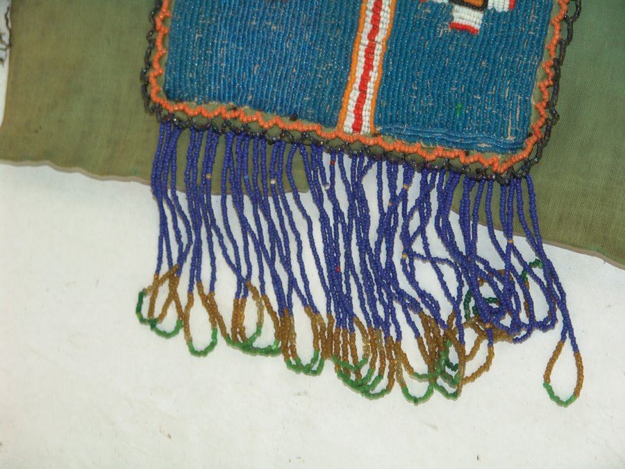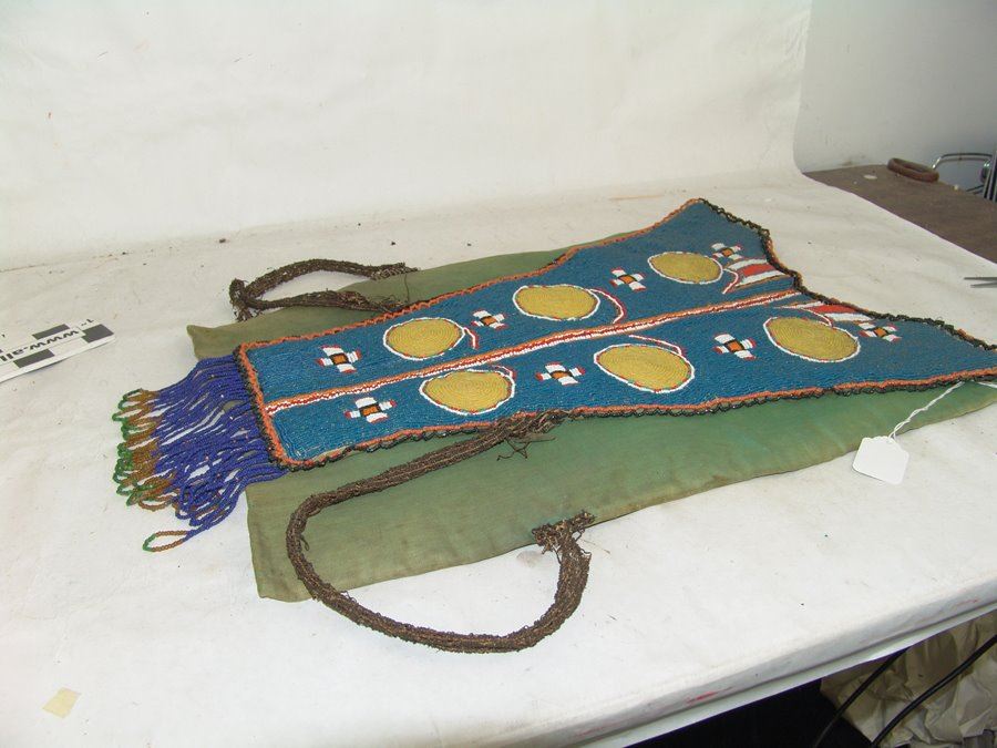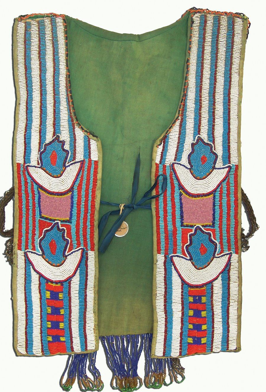 Rare Southern Plains lazy stitch and contour beaded men's throw over vest/yoke with interesting floral forms on front and round yellow circles (fruit ?) on the back. Good condition, minor bead loss. The only one,Early 1900s,20" x 13"