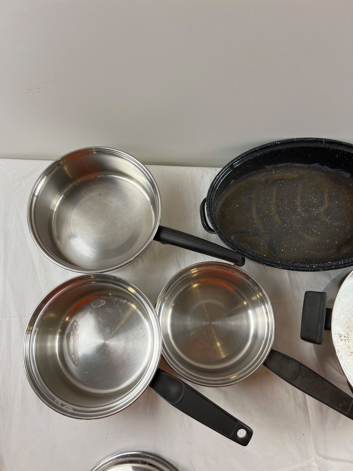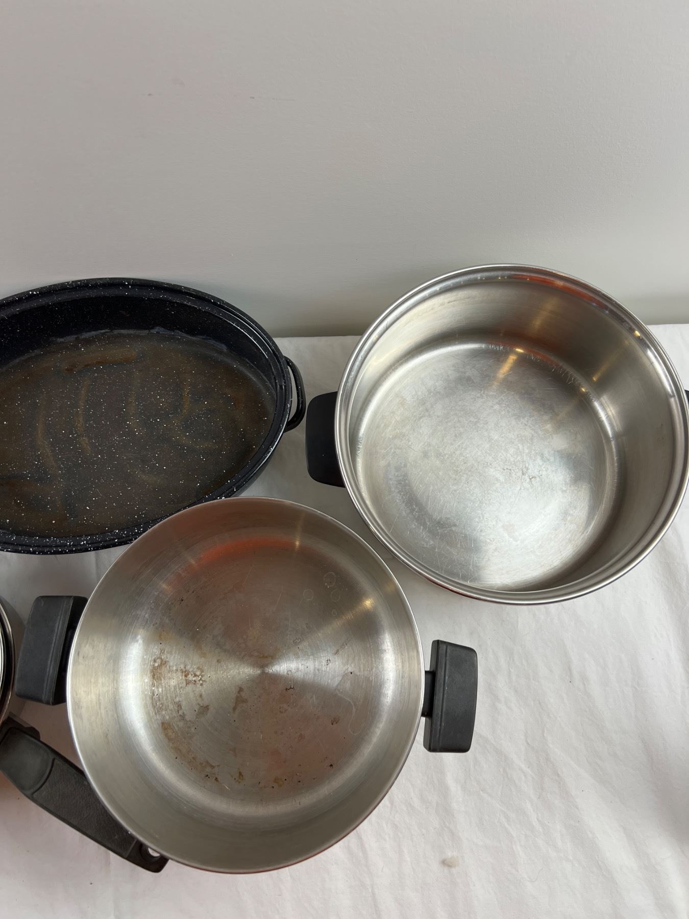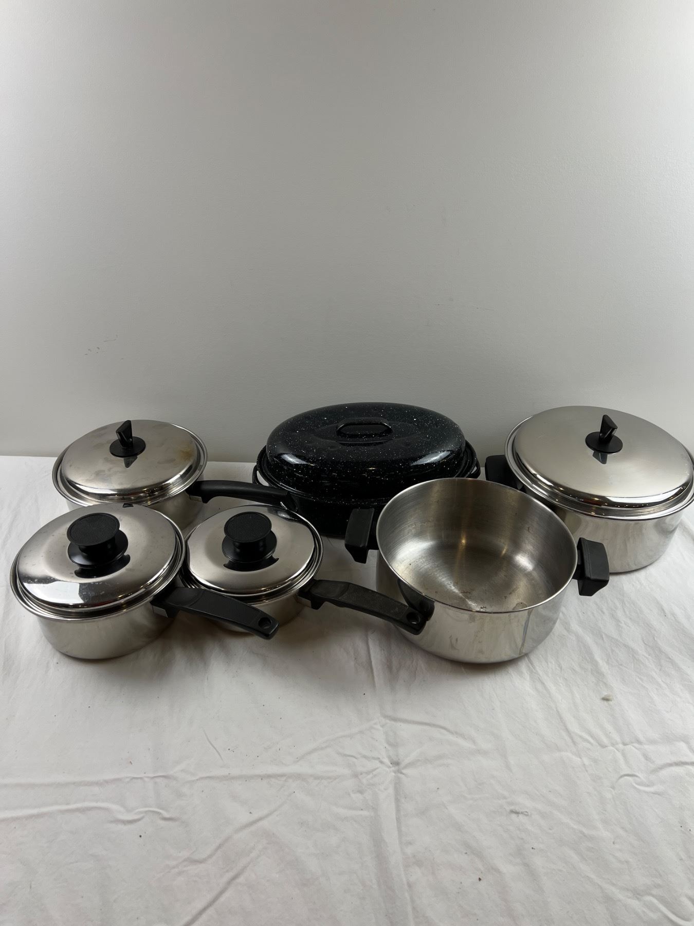 Also includes a graniteware roaster measuring 13.5" by 9". Some marks to bottoms of pots and cook surfaces of pots. Rust to roaster interior.