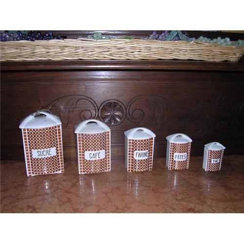 5 pots a epice/spice jars in a a brown check pattern. Some very monor imperfections. Please feel free to request more detailed photos. Imported from the Sarthe region of France.