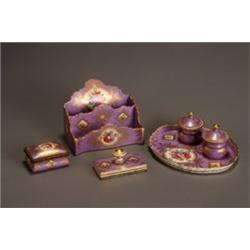 Consisting of a letter rack, a standish, a stamp box and a blotter; each polychrome decorated with floral cartouches and birds on a lavender ground. The letter rack and standish with blue painted factory mark and inscribed Dec. 981./DTposT. Hairline crack and chip to tray of standish.