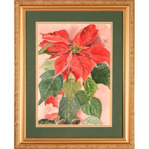 </font></strong>This remarkable watercolor poinsettia by the skillful artist Olive Rowland has been meticulously crafted to reveal significant detail throughout the poinsettia itself as well as in the many surrounding leaves. The complementary colors of the reds and greens play off of each other so magnificently so as to keep the viewers eyes continuously swirling all over the composition. Though the poinsettia is located centrally, it rises to the top, seeming to blossom right off of the surface of the piece. The forest green mat highlights the garnet flower, and the second gold mat underneath continues to aid in this culmination. The fabulous ornate golden wood frame adds that special touch to the complete work, supporting not only the color choices, but also the beauty of the design. The image itself measures at about 10 x 14, but including the frame it comes to 16 ¾ x 20 ¾ . An excellent price for an excellent work.</font>