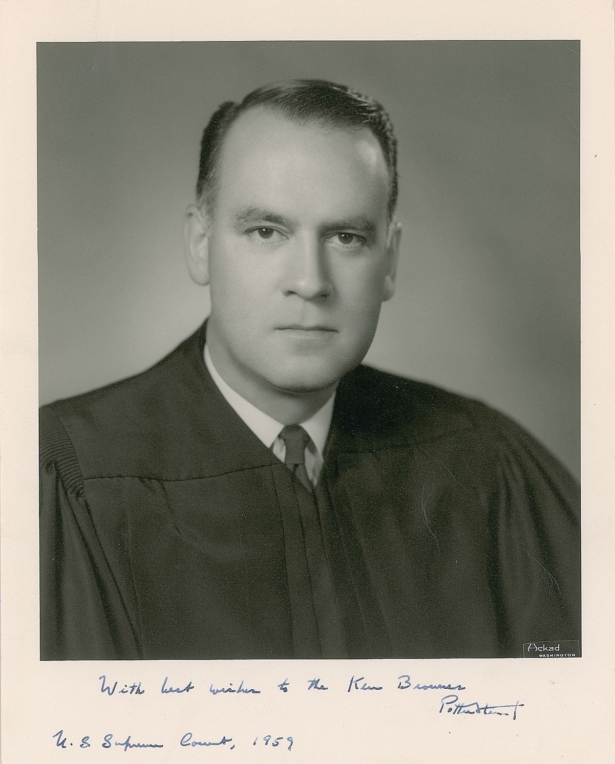 Three items signed by Stewart: an outstanding vintage matte-finish 8 x 10 portrait by Ackad of Washington, signed and inscribed in the lower border in fountain pen, "With best wishes to the Ken Brownes, Potter Stewart, 1959"; a TLS on Supreme Court letterhead, November 4, 1958, in part: "None of the press photographs taken during the early days of my appointment have been made available to me"; and a TLS on Supreme Court letterhead, May 29, 1959, in part: "I have had some photographs made recently, and I am happy to enclose a print which I have autographed." In very good to fine condition, with some creasing, a couple of paperclip impressions to the top edge, and two small surface dings to the left background area of the photograph. Accompanied by two original mailing envelopes and a letter by his secretary, Elizabeth Kenney.