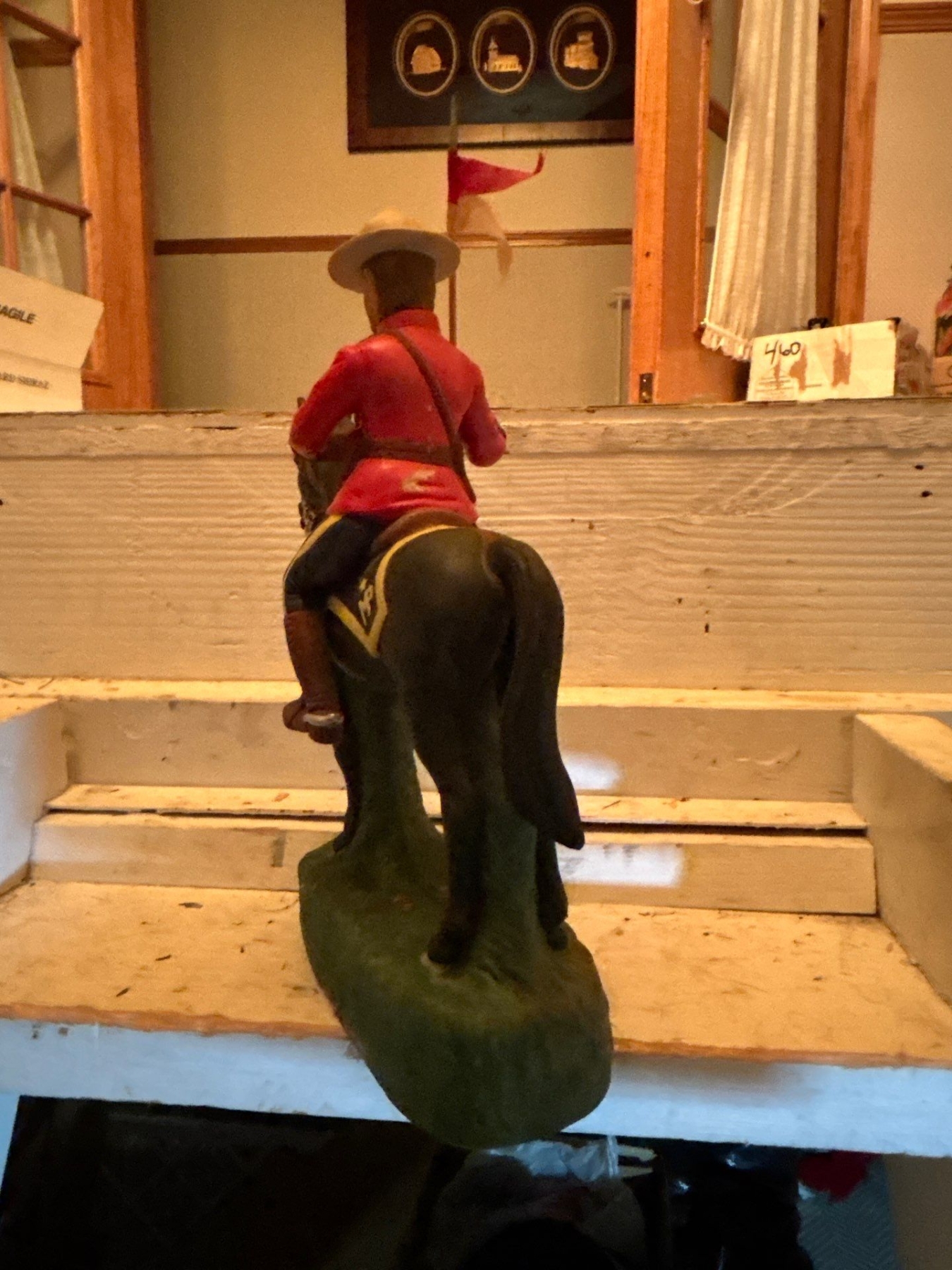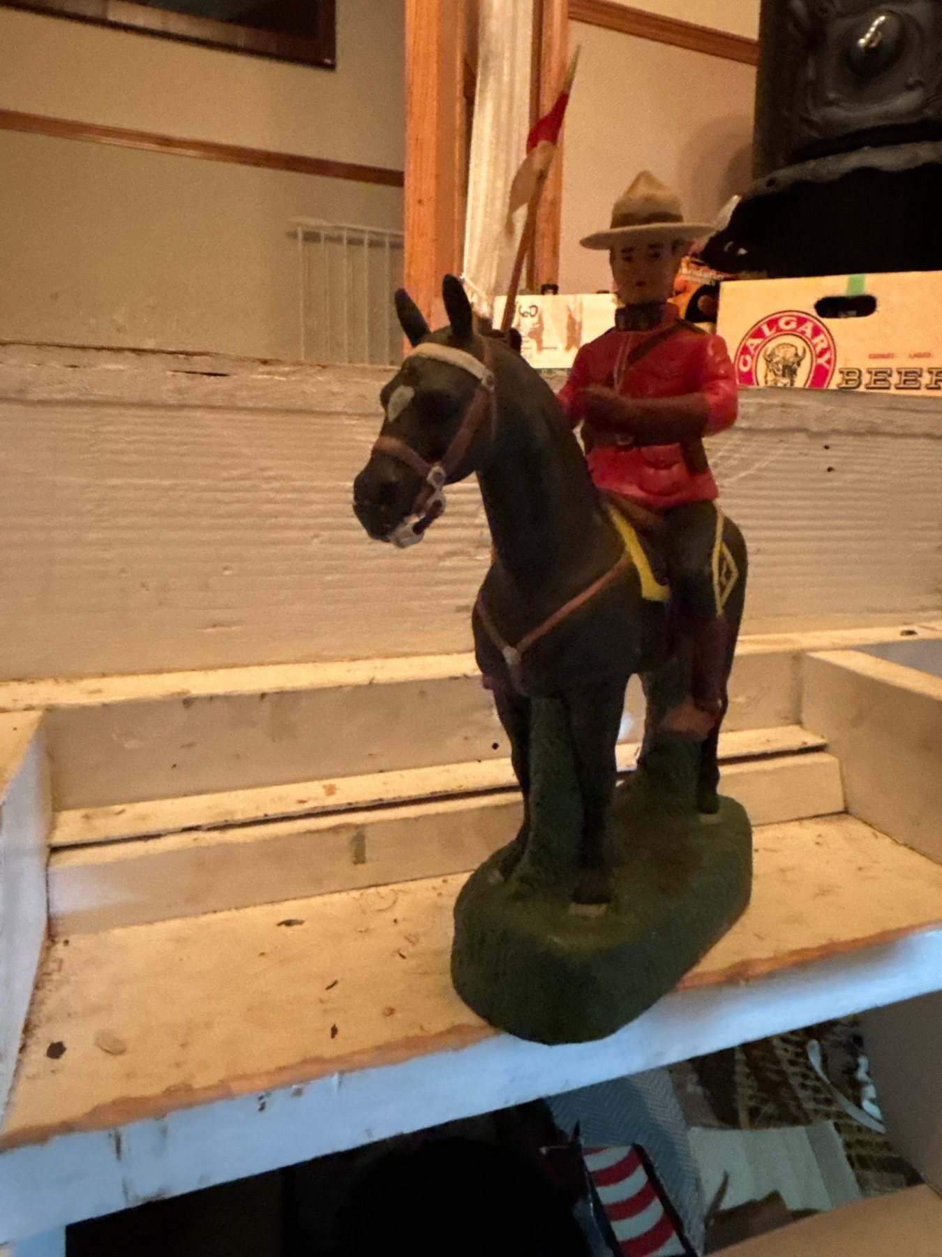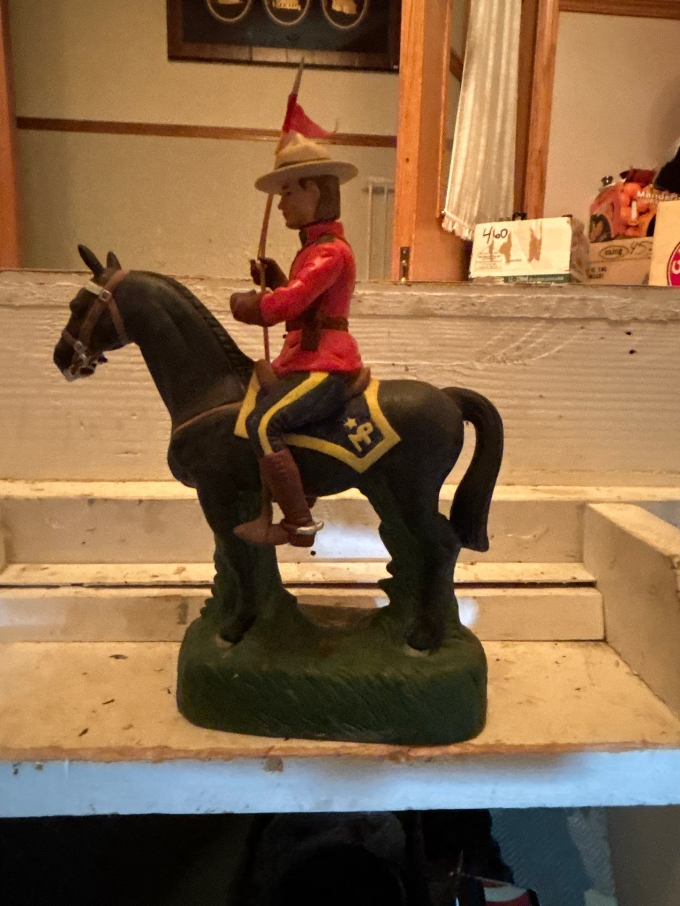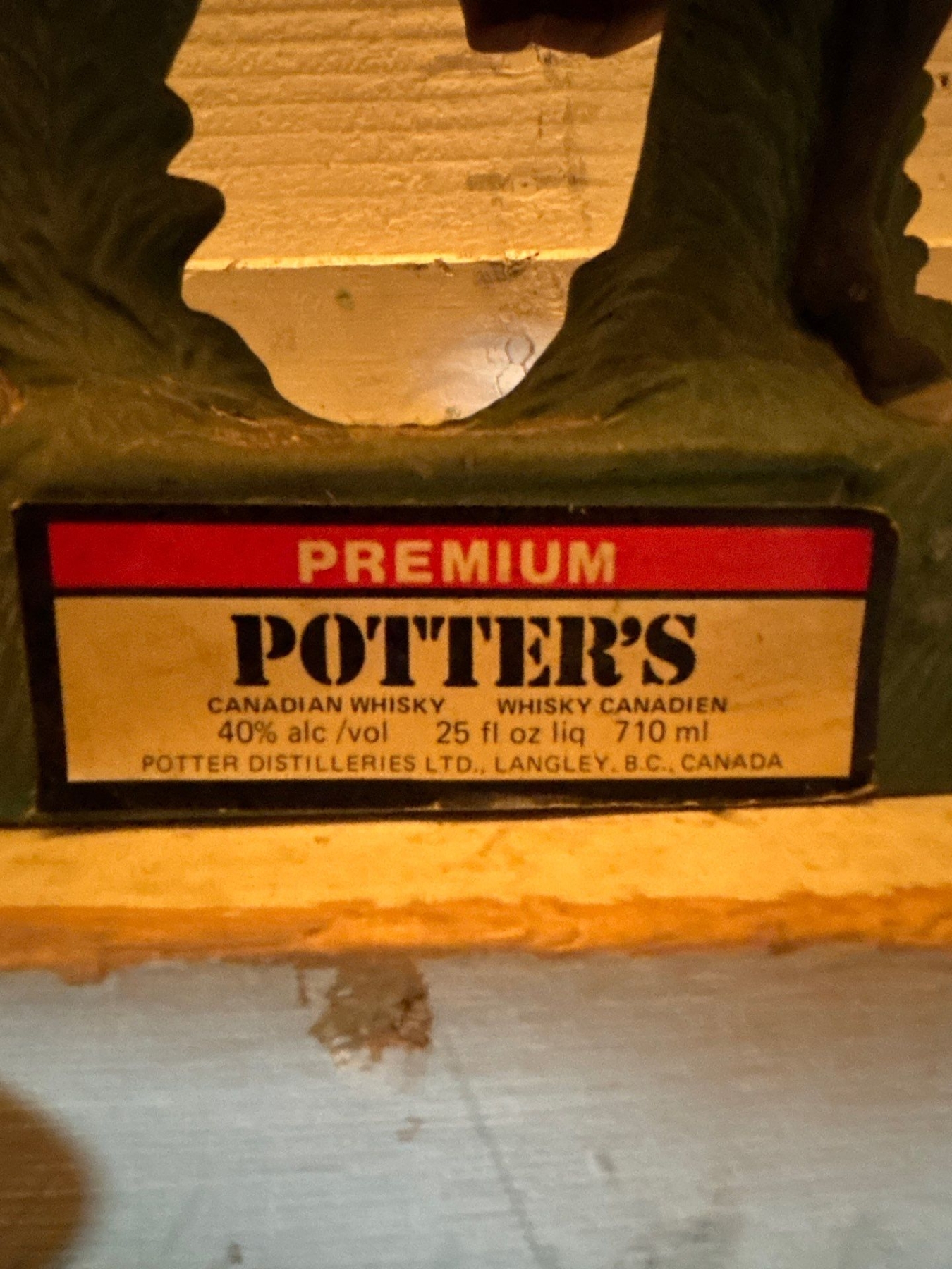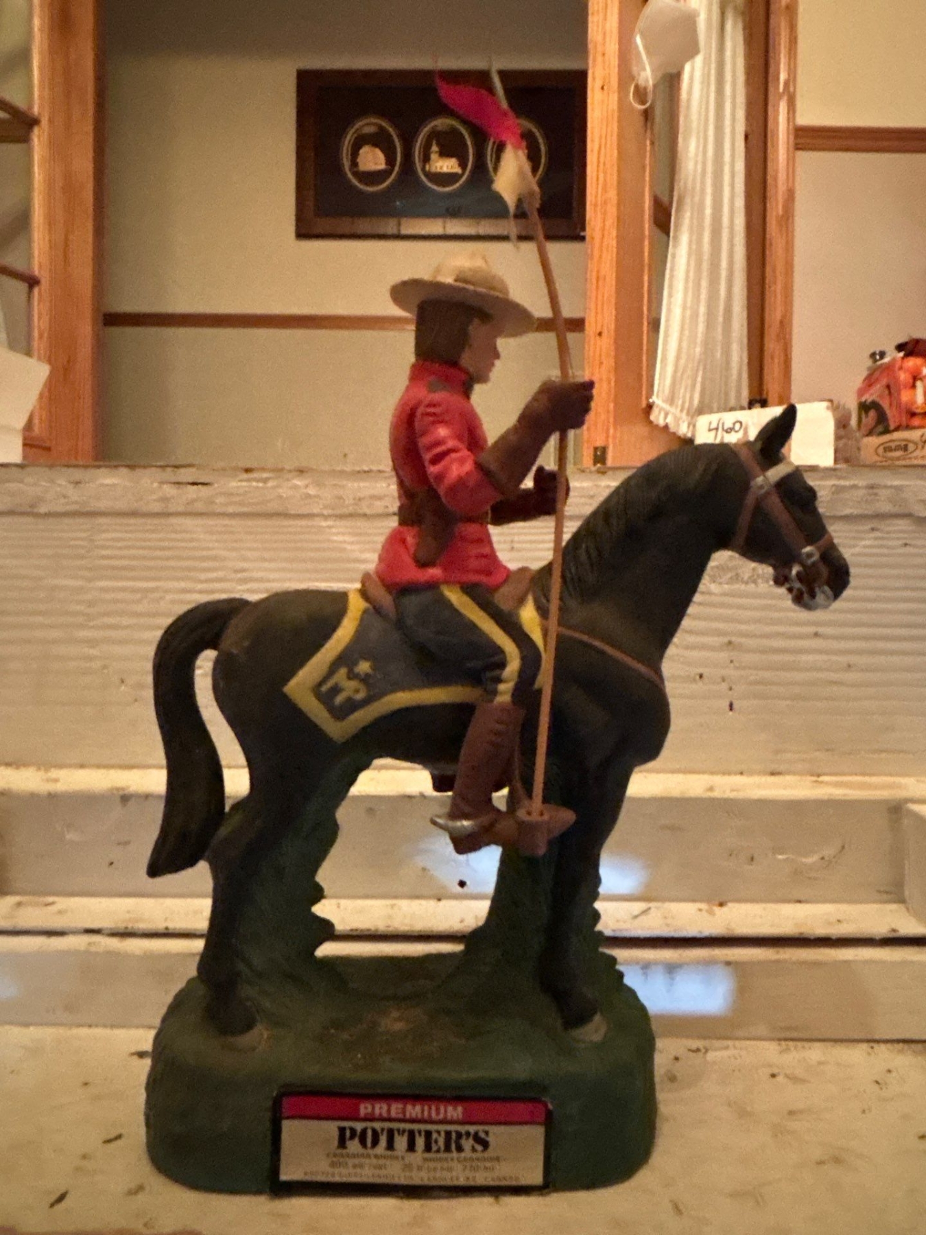 Potter's Premium Canadian Whisky decanter shaped like a Royal Canadian Mounted Police (RCMP) officer on a horse. In good condition, green paint is kind of faded.