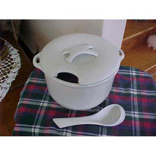 <table width="100%" border="0" cellspacing="0" cellpadding="4"><tr><td><em> </em></td></tr><tr> <td width="100%"> Pottery, Bennington, Vt. signed on bottom , from the org. 1891 sauce pot cover and ladle; 9" Diameter with handles; 8" tall with cover handle;; Ladle 8.5" long; good condition, no nicks,dings etc. </td></tr><tr> <td> </td></tr><tr> <td>Reference #: pg_73_8G_Pic_801</td></tr><tr><td>Condition:good</td></tr><tr><td>Year:(c)1891</td></tr><tr><td>Country:USA</td></tr><tr><td>Height:8" tall</td></tr><tr><td>Width:9" Diam.</td></tr><tr><td>Weight:12 lbs.</td></tr><tr><td>Title:Pottery, Bennington, Vt..signed</td></tr><tr><td>Location:Shaftsbury, Vermont</td></tr></table>