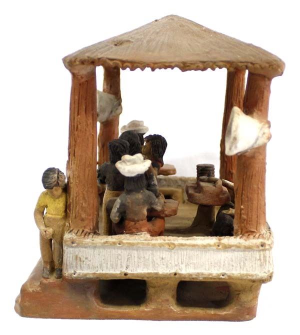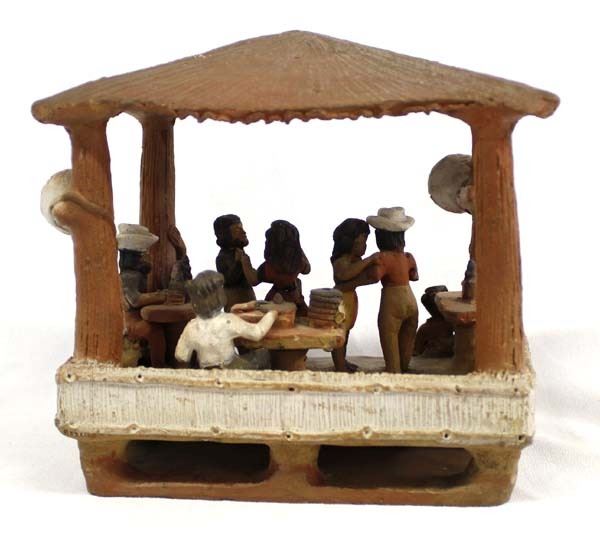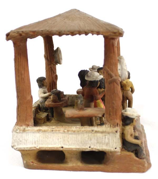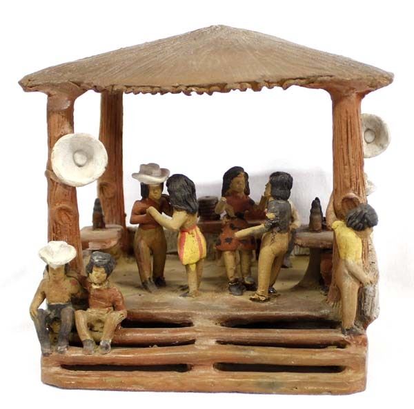 Vintage Pottery Dance Hall Scene by Santiago Guiviez of La Pila, Manabi', Ecuador, measures 6'' x 6.5'' x 5'' and is signed on the bottom, there is damage to one of the dancing couples