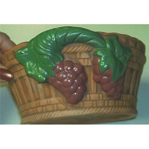 I am featuring for auction today a very pretty, clay pottery, FTD planter. Decorated with purple grapes and green leaves, which have a glossy finish. Made of clay. The handles are green painted branches and leaves with two pods of purple grapes. The bottom of the FTD planter is embossed: C. FTD. R. - MADE IN THAILAND. Gloxy finish on the inside with the outside having a dull finish. Still, this is a beautiful FTD Flower Plainter for those wonderful spring or summer flowers to set on you deck or patio. This planter measures: 3 2/8 inches tall; opening diameter measures 6 1/8 inches; depth measures 2 7/8 inches; bottom base measures 5 inches in diameter. A wonderful FTD Clay pot with the outside decorated with a basket design and both sides having two grape pods and leaves. This lovely dish is in excellent Condition.