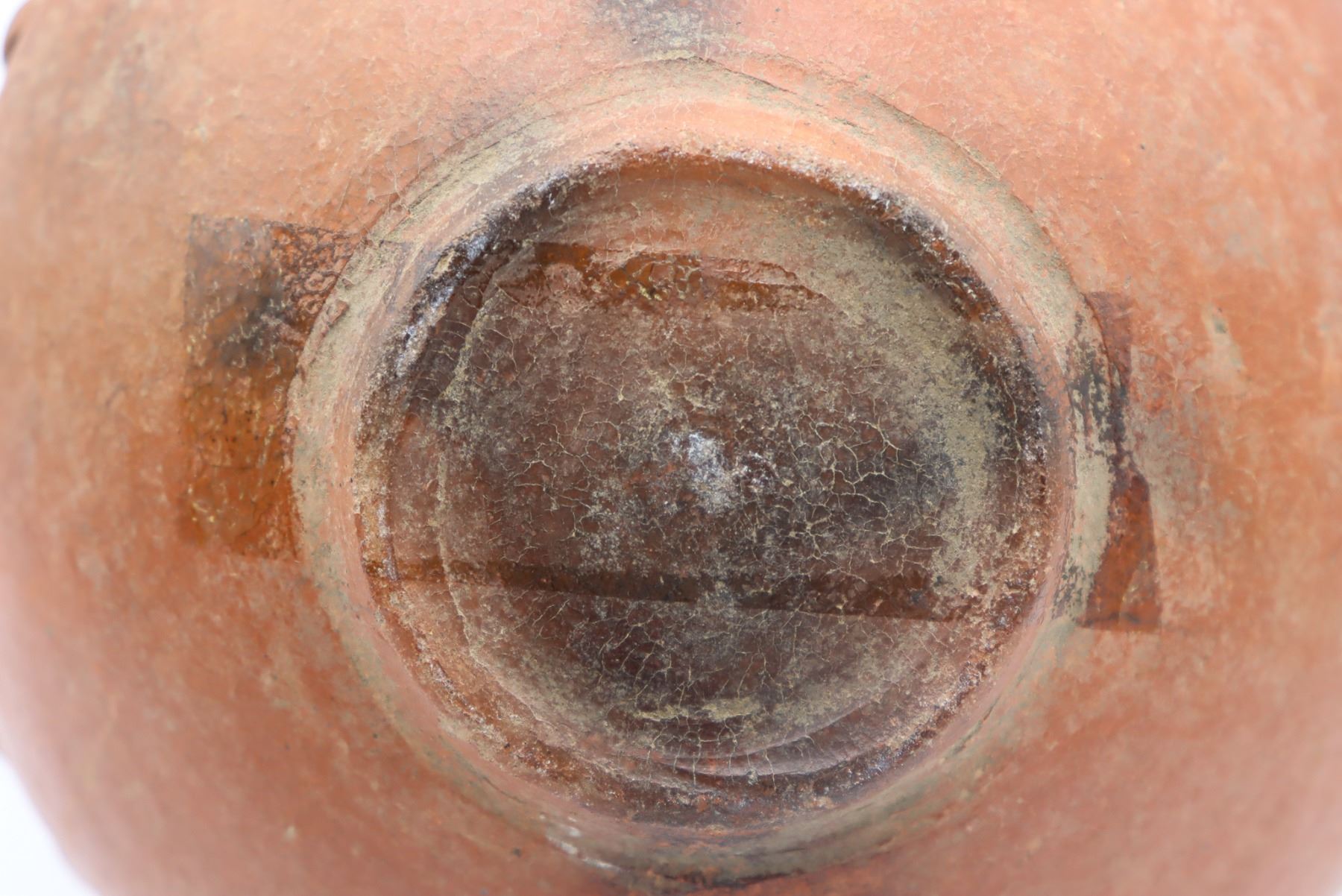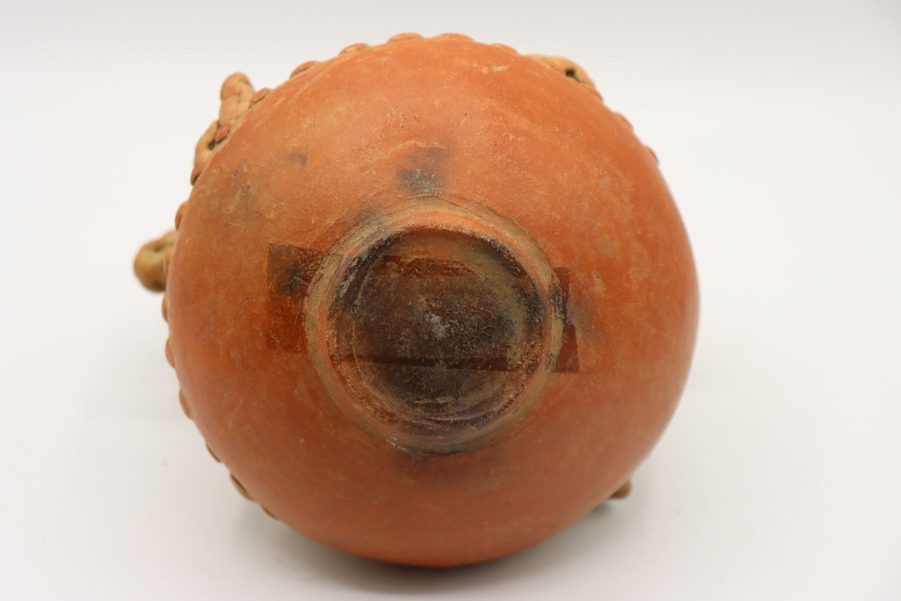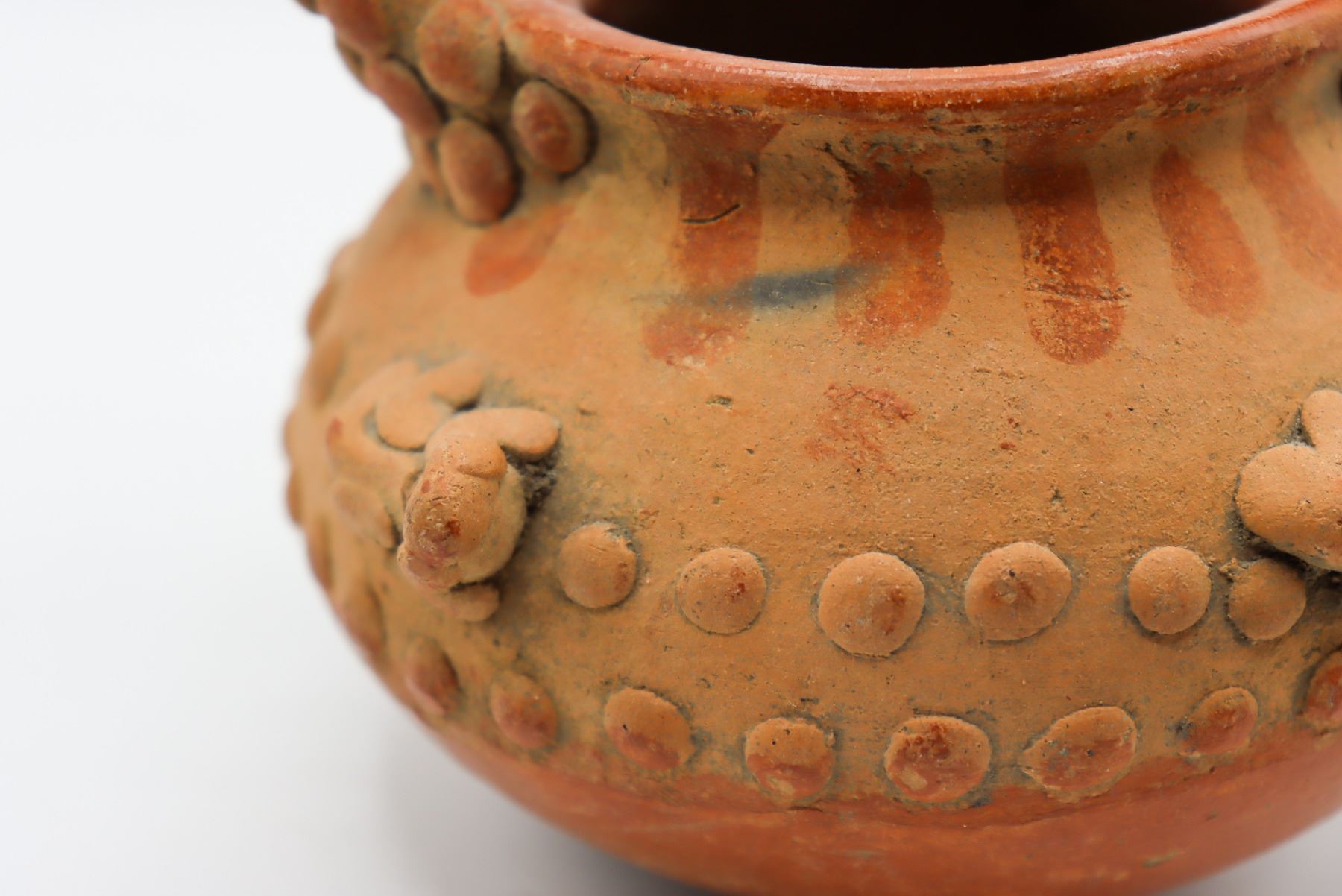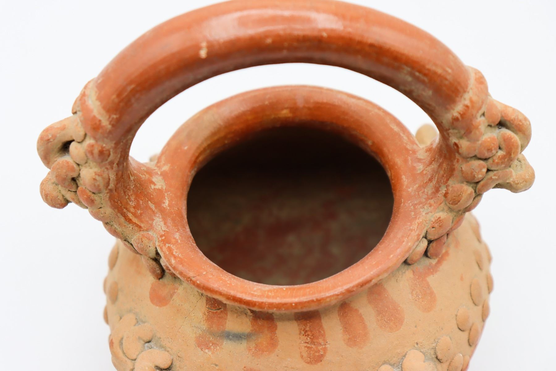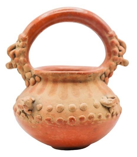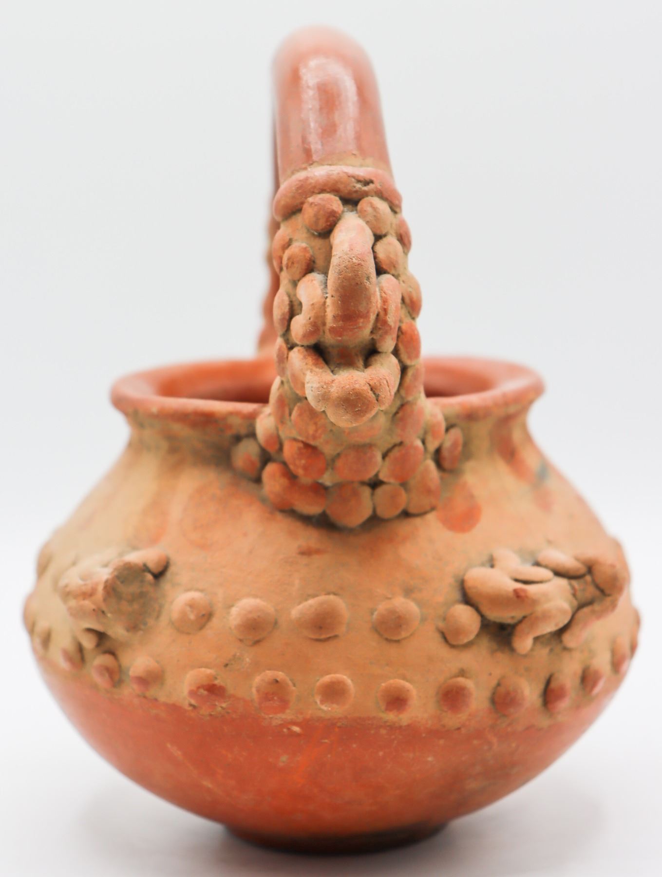 Low fire ceramic vessel with handle, slip and decorative additions, in the style of Pre-Columbian ware.