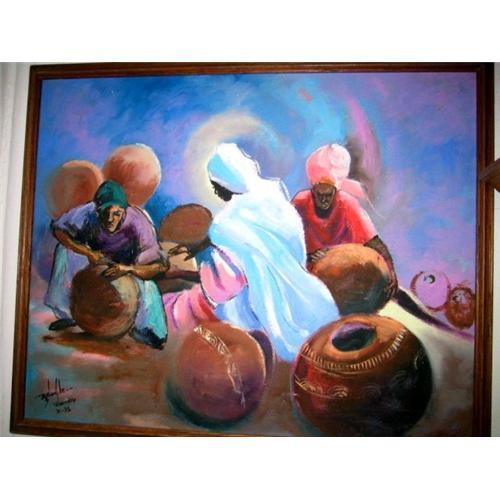 Beautiful Painting from Chinedu the Man who as the raditionla dress in white look like the white color become blue is just beautiful also the pottery on the floor have nice African design.