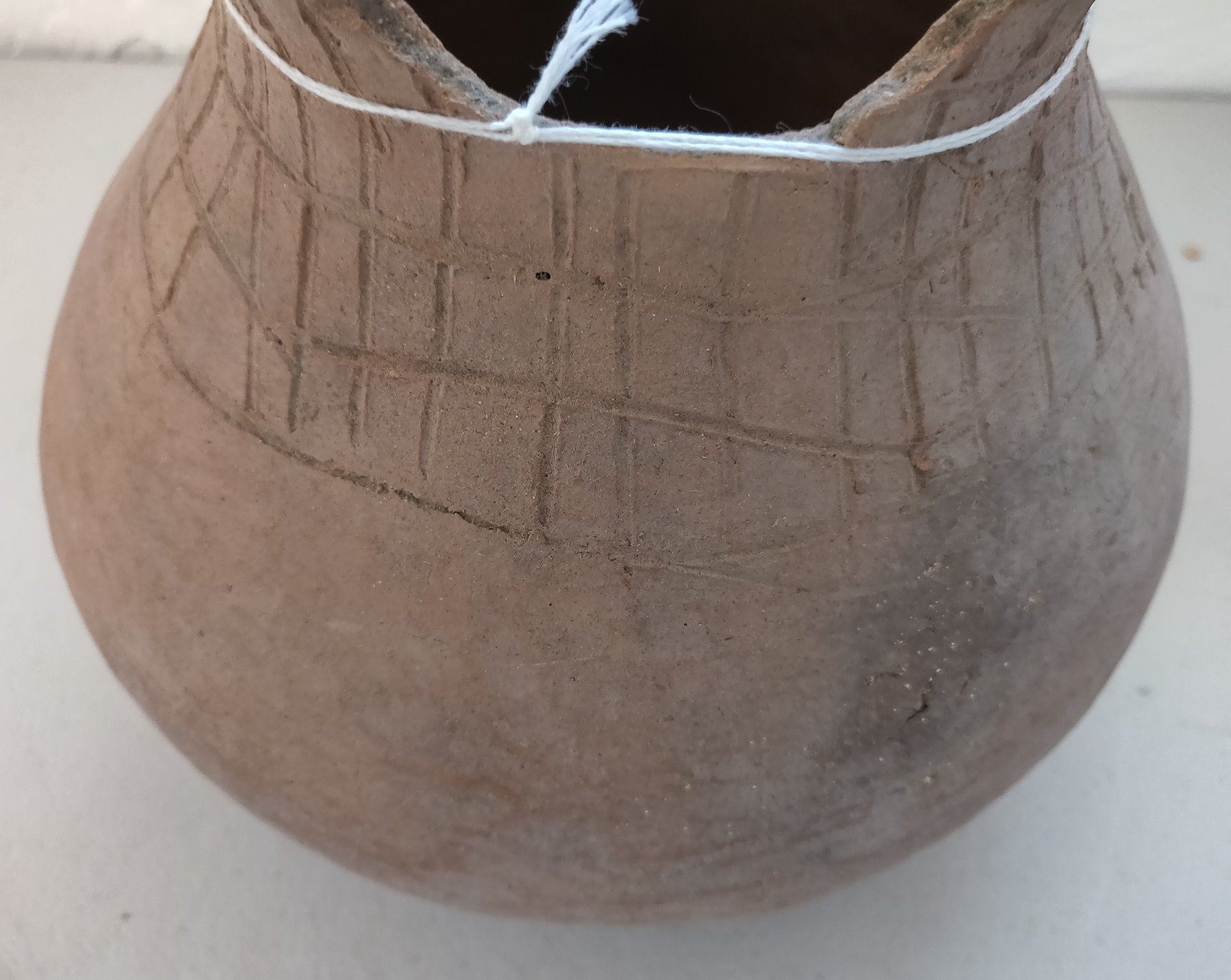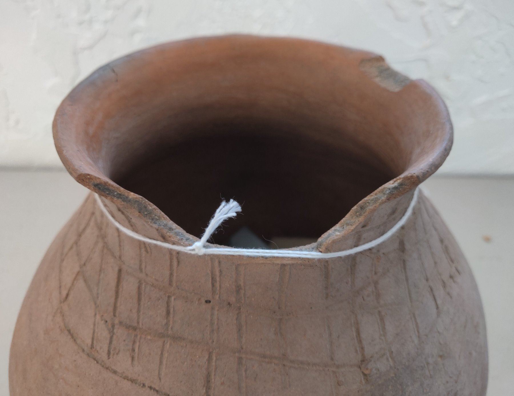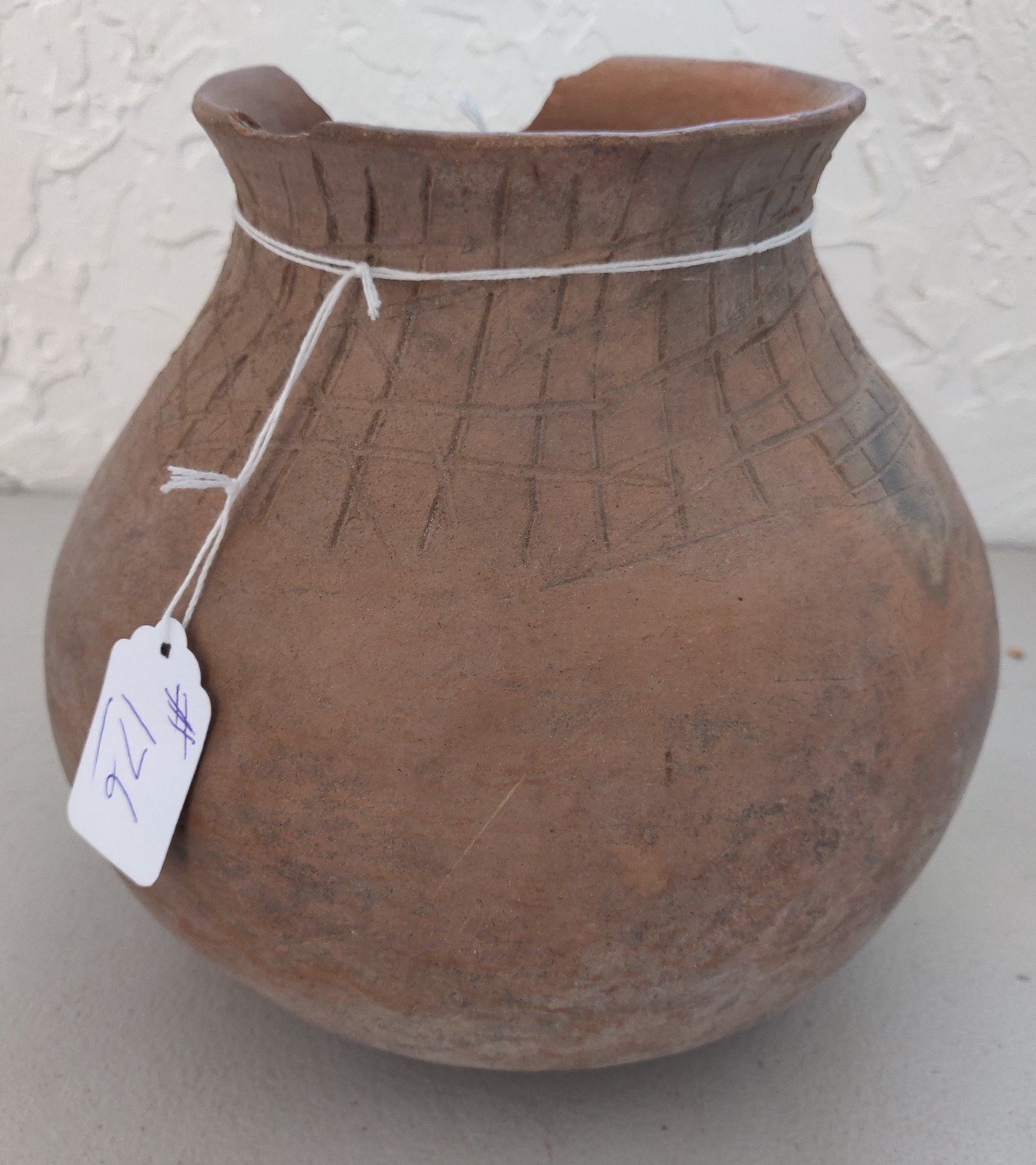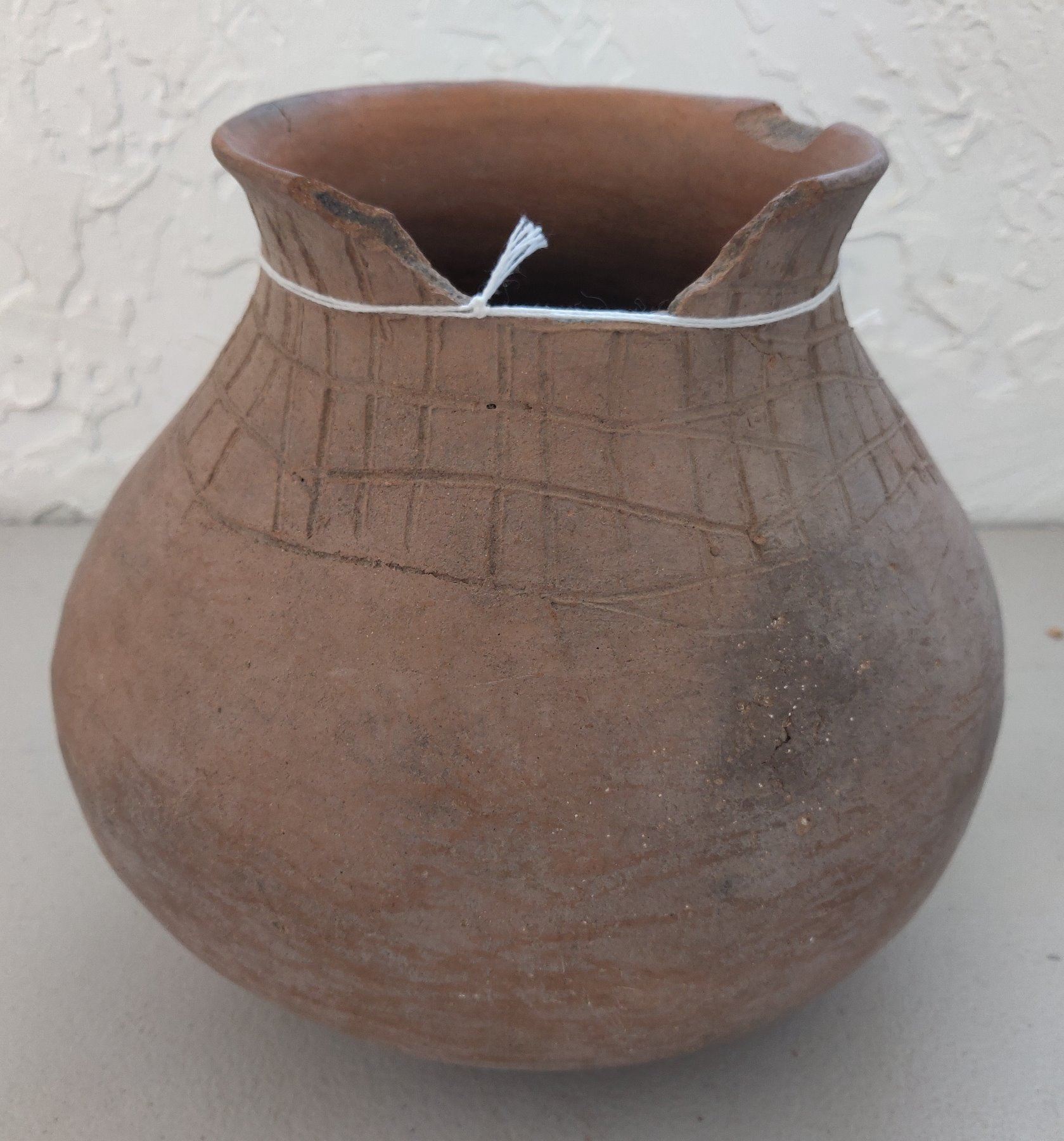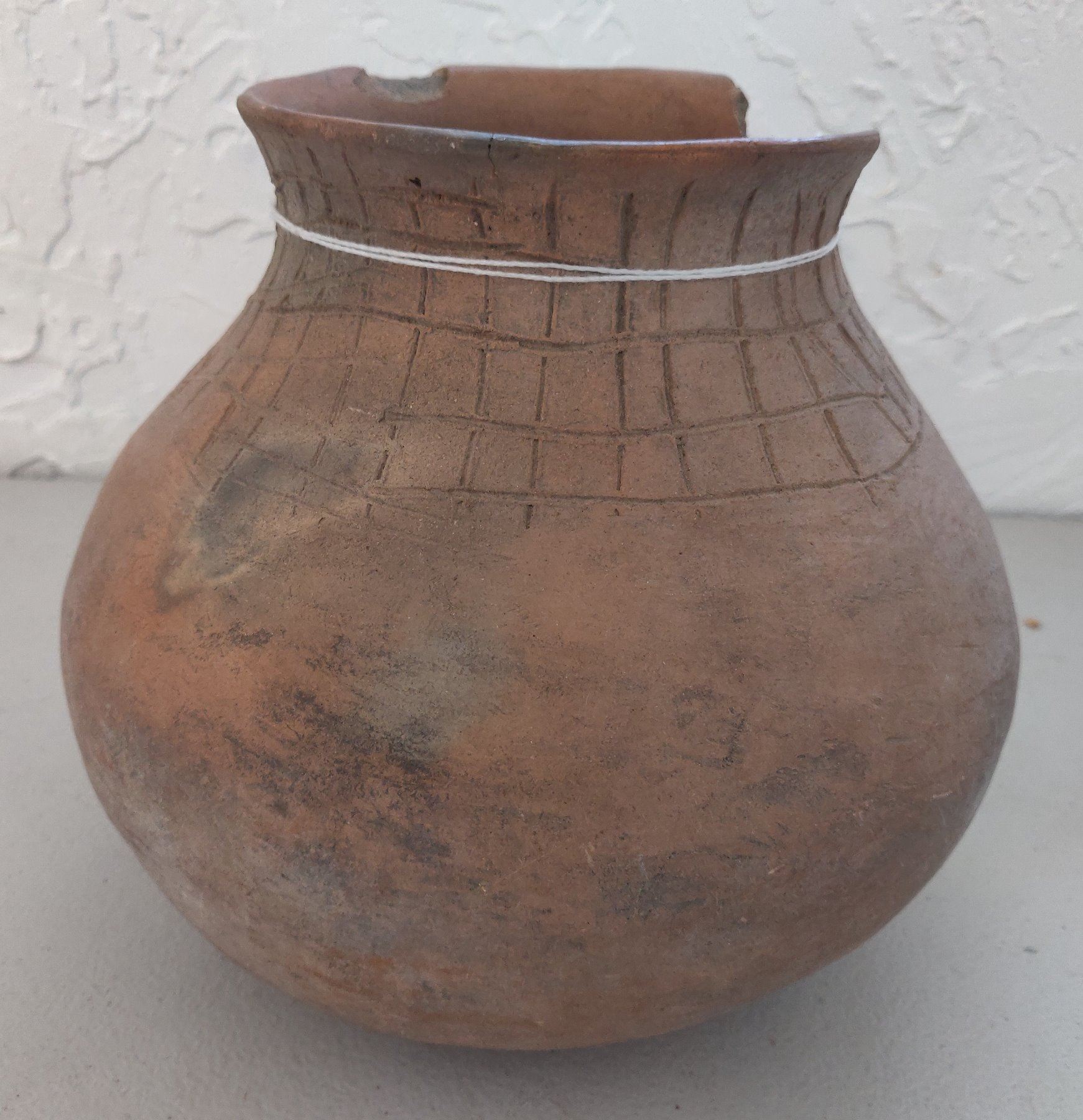 Pottery Olla, pre-historic item. Made of clay, the item measures 7" x 7". Ajo, Pima County, Arizona. Condition: Engraved neck, chips off rim, see images. Shipping: $45.00 USA estimate only, double-boxed, w/insurance and signature, due to size and weight.