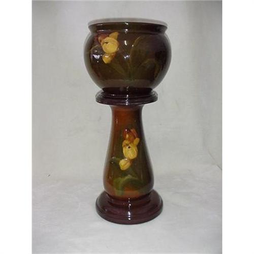 Roseville, Rookwood, Weller? Jardinière and Pedestal. No Marks anywhere Pedestal 18 1/4" tall x 10 1/2" in diameter at the base. Base has been repaired. Jardinière 11 1/2" in diameter x 9 1/2" tall, impressed with the number 2 on underside. Painted with tulips on a green and dark brown ground.