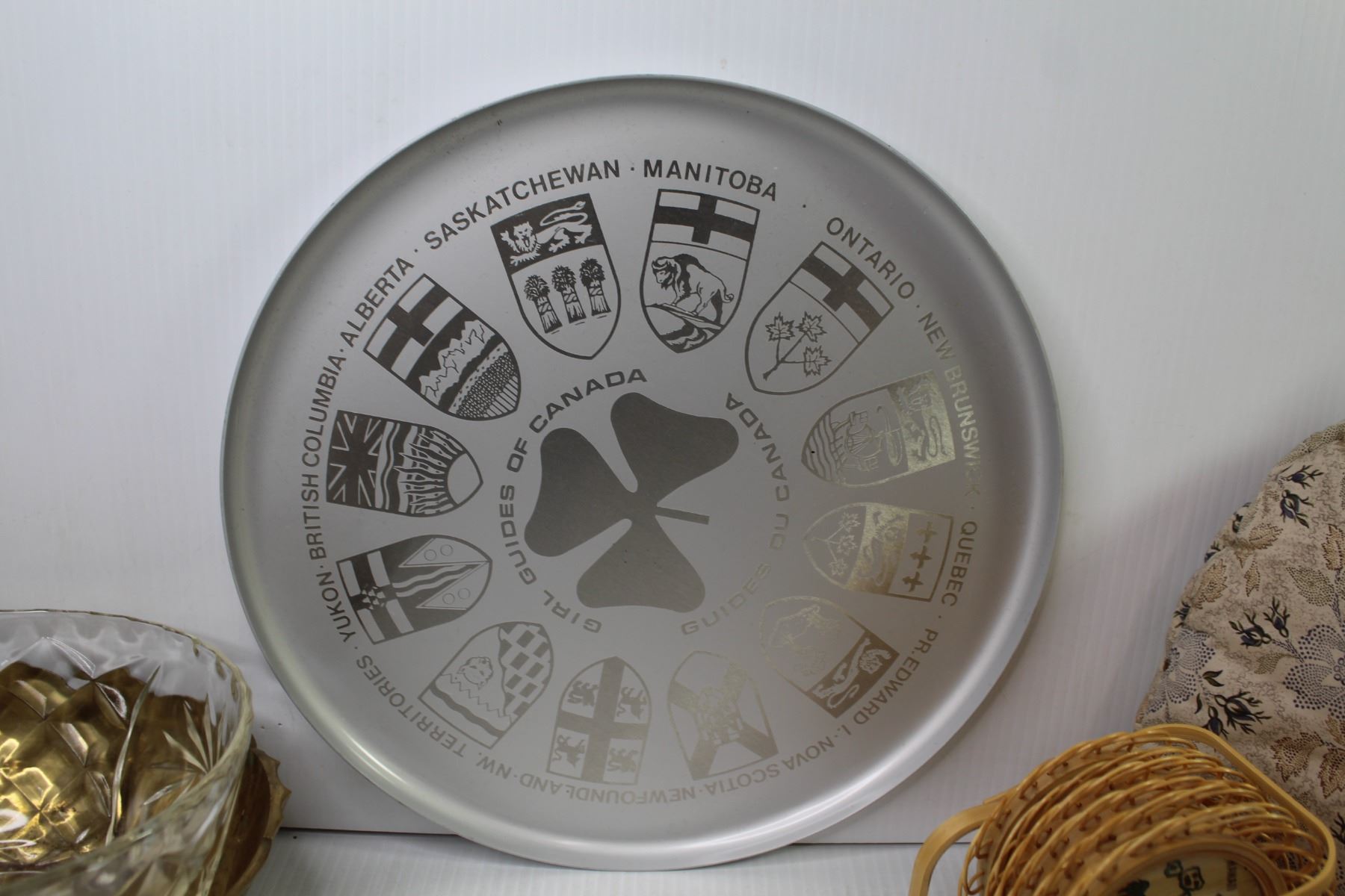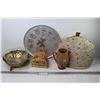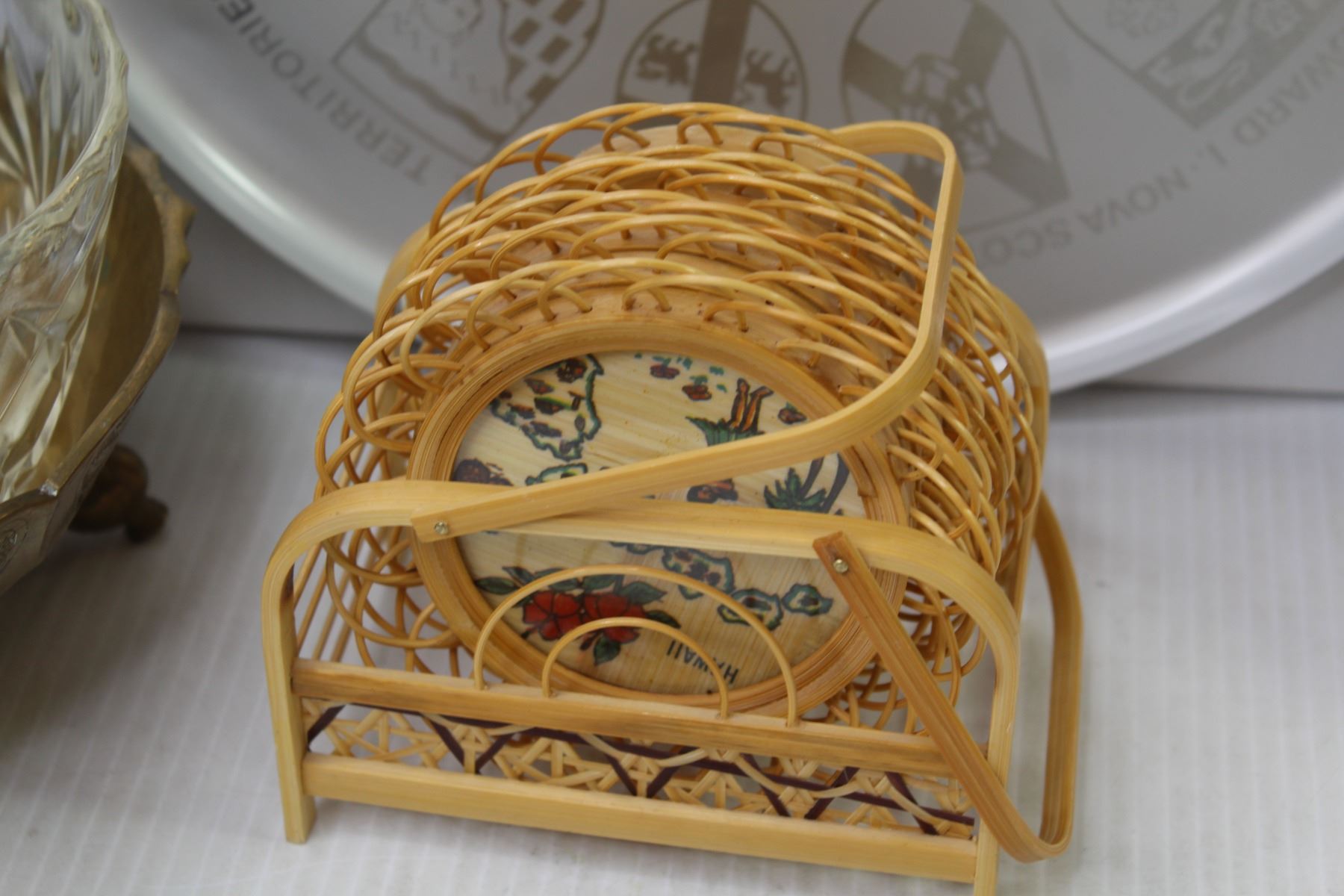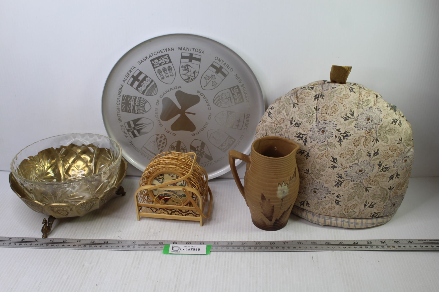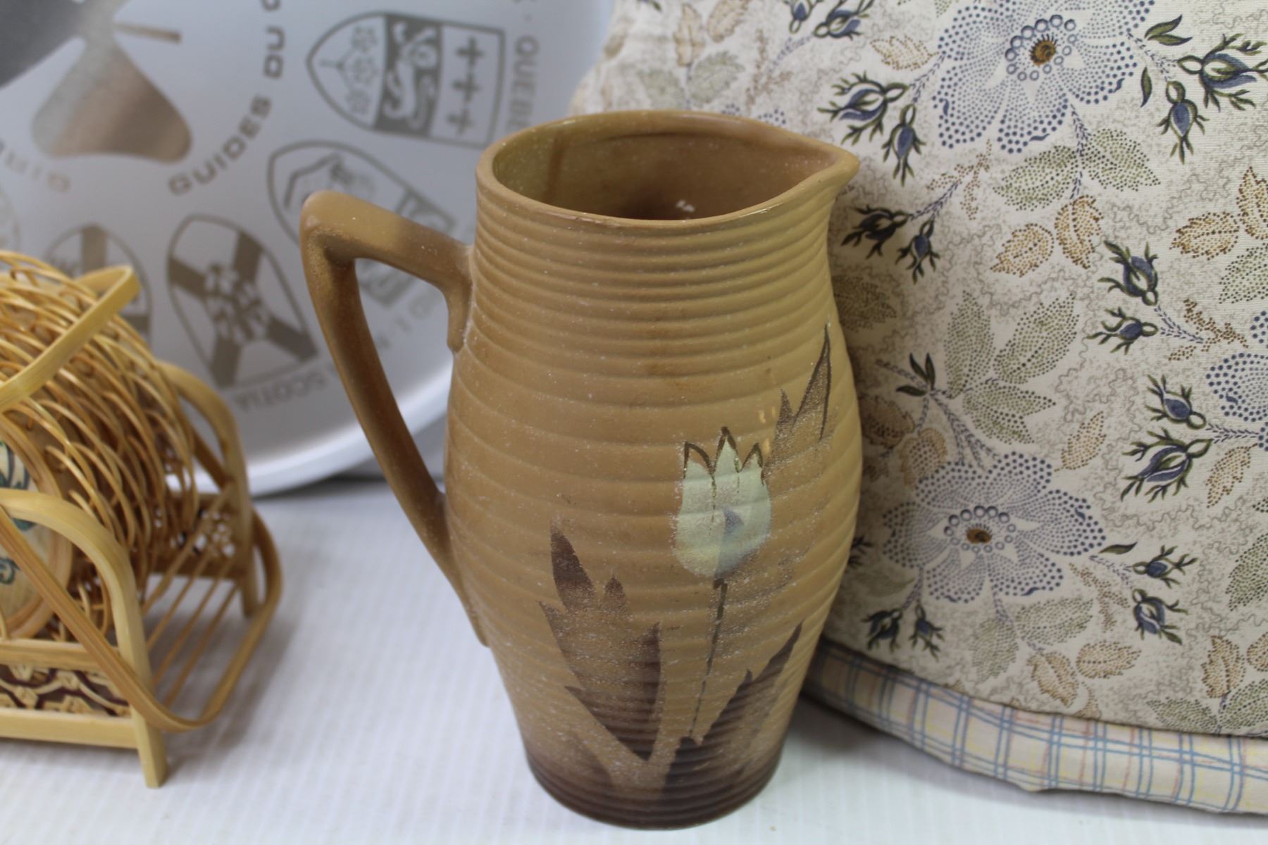 Pottery Pitcher - (Made in England) - Provincial Metal Tray - Tea Pot Cover - Wicker Coasters - Glass Bowl - Brass Footed Bowl;