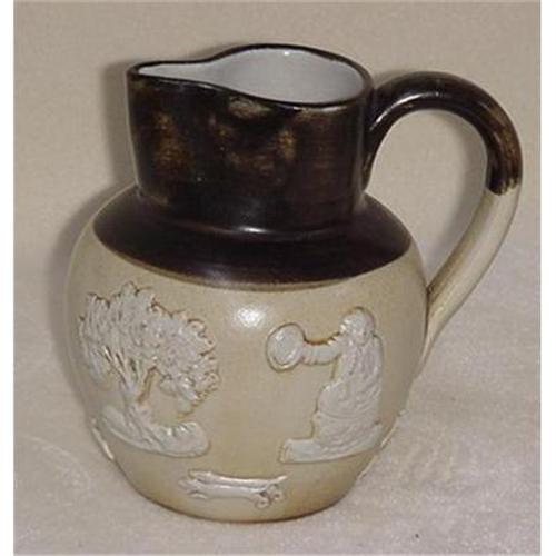 An English pottery pitcher, 5 1/2" tall, 4 1/2" in diameter. Decorated with raised figures of trees, hounds chasing the fox and mounted rider following the hunt, marked Bourne,