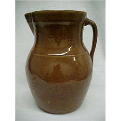 Pottery pitcher in urn form with applied handle, brown tin glaze on interior and exterior, 11" h., mid 19th C.