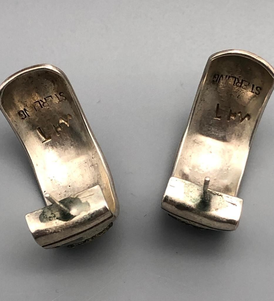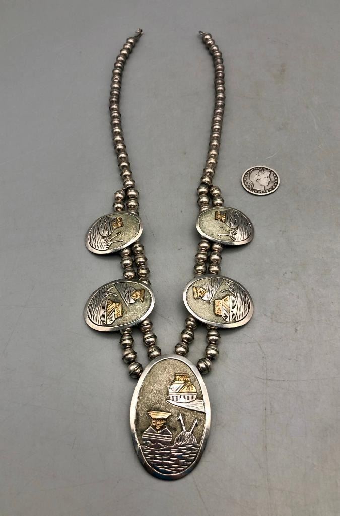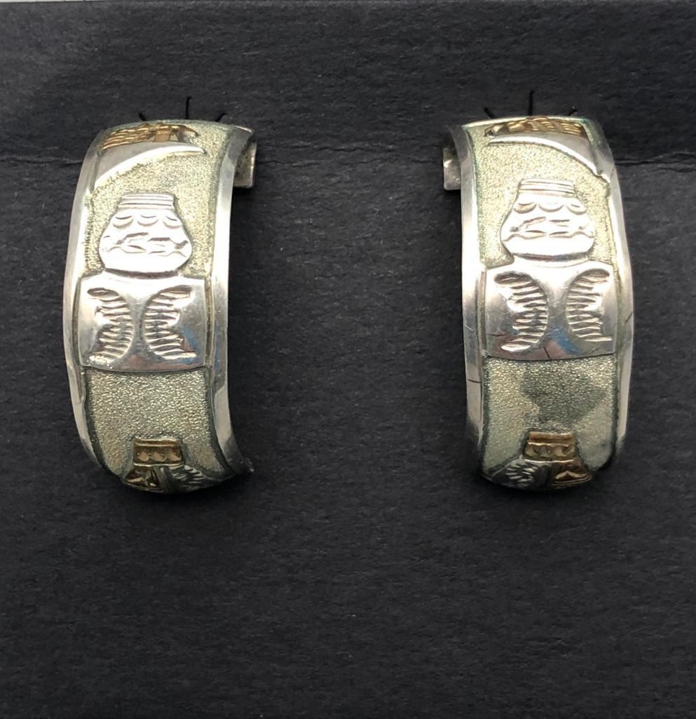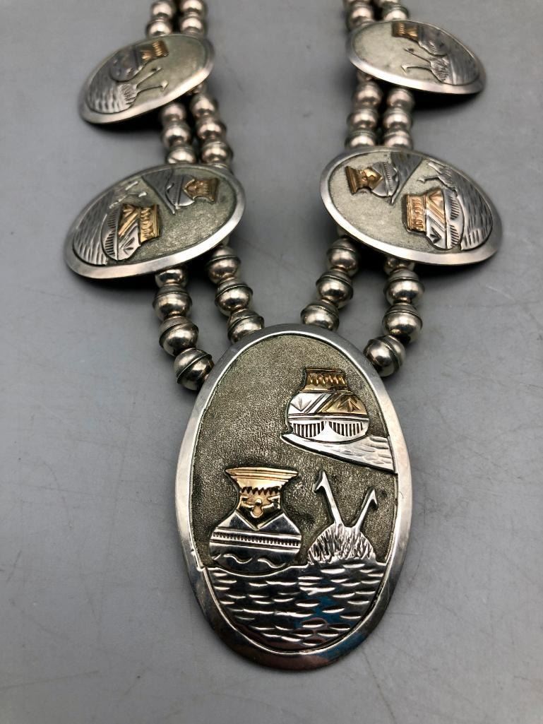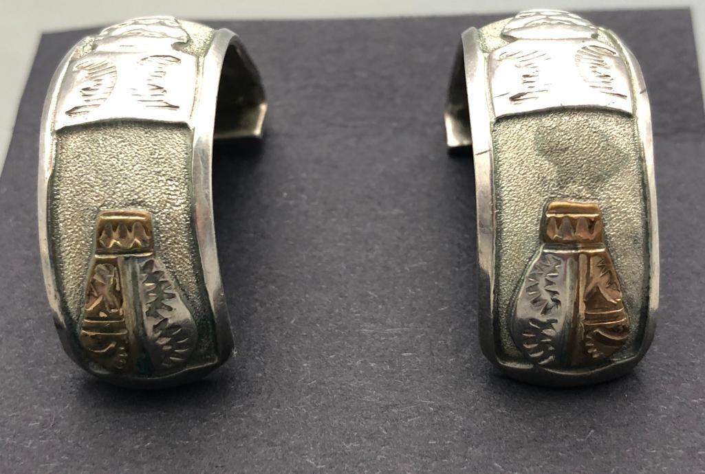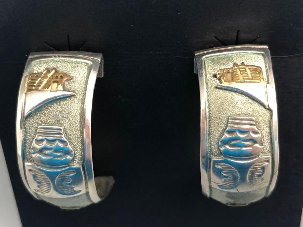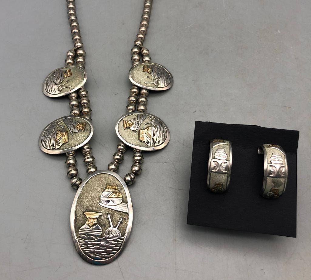 For sale in this lot is a pottery themed sterling silver necklace and earrings set. This is a gorgeous overlay set with a pottery theme in silver with gold accents. The matching half hoop earrings go perfect with the necklace. It is stamped as sterling. Maker: Hallmarked with a partial letter and T. Approx. Age: Circa 1970s-1980s. Size: Fits a 21 inch neck. Pendant measures 2-1/4 inches long X 1-1/2 inches wide. Earrings measure 1-1/2 inches long X 1/2 inch wide. Weighs 94.1 grams. Condition: Good for its age, normal wear expected. Please look closely at the pictures - they are an important part of our description. Shipping: There will be a $5 handling / packaging fee for shipping this lot. The actual cost of postage will be added on top of that. BUY IT NOW: If you would like to buy this item now without waiting for the auction to end (this option is only available up to 48 hours before the auction starts to close), the “Buy it Now” price is the high estimate of this lot. If you would like to end the auction early and pay the high estimate (plus applicable fees), please contact us by phone or email and reference this lot number.