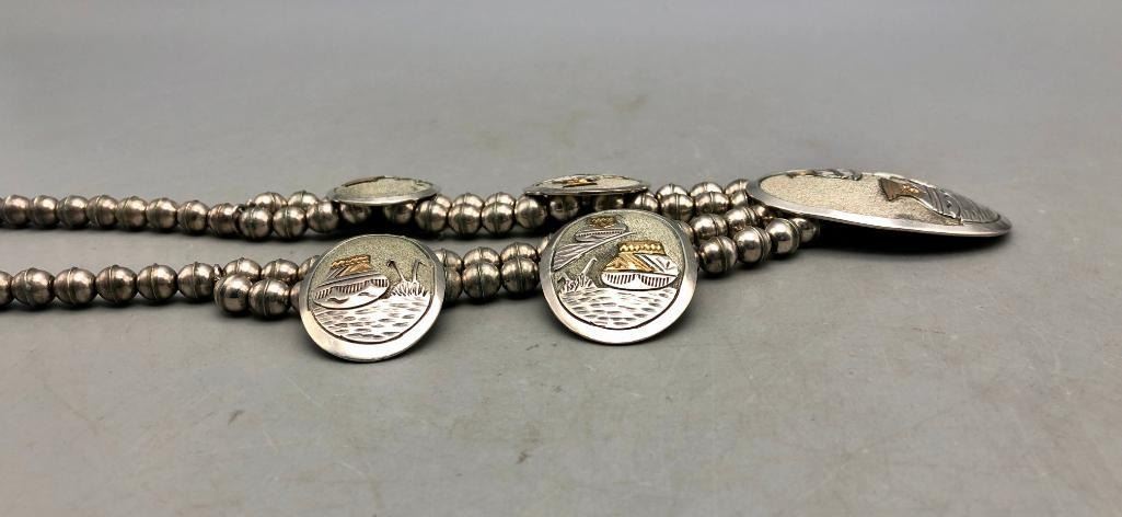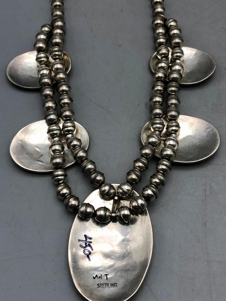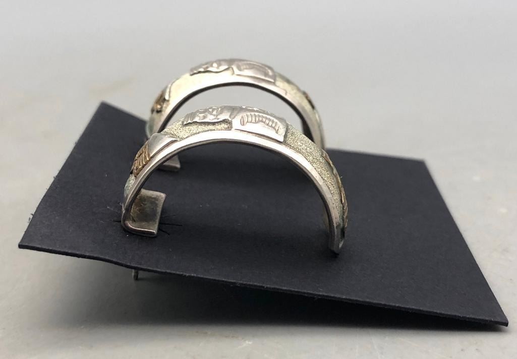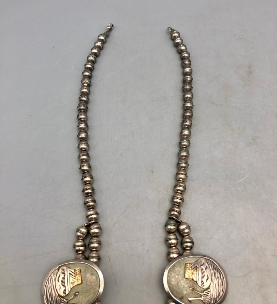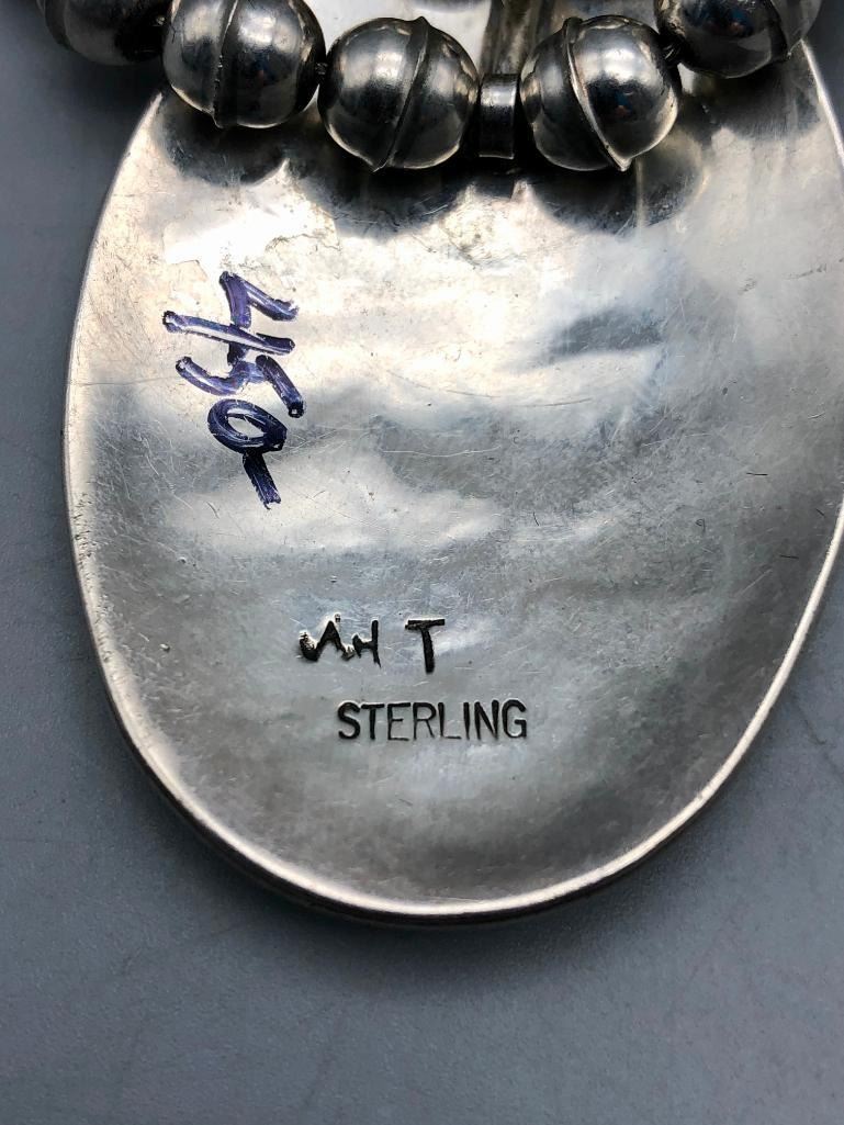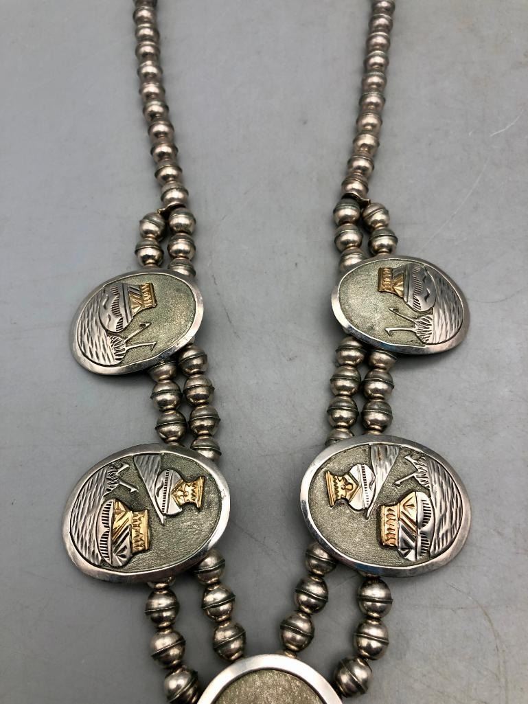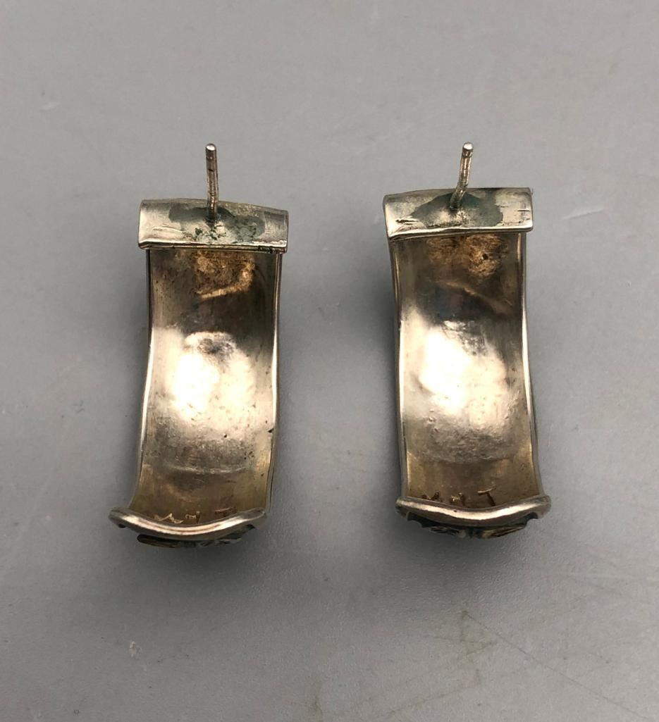 For sale in this lot is a pottery themed sterling silver necklace and earrings set. This is a gorgeous overlay set with a pottery theme in silver with gold accents. The matching half hoop earrings go perfect with the necklace. It is stamped as sterling. Maker: Hallmarked with a partial letter and T. Approx. Age: Circa 1970s-1980s. Size: Fits a 21 inch neck. Pendant measures 2-1/4 inches long X 1-1/2 inches wide. Earrings measure 1-1/2 inches long X 1/2 inch wide. Weighs 94.1 grams. Condition: Good for its age, normal wear expected. Please look closely at the pictures - they are an important part of our description. Shipping: There will be a $5 handling / packaging fee for shipping this lot. The actual cost of postage will be added on top of that. BUY IT NOW: If you would like to buy this item now without waiting for the auction to end (this option is only available up to 48 hours before the auction starts to close), the “Buy it Now” price is the high estimate of this lot. If you would like to end the auction early and pay the high estimate (plus applicable fees), please contact us by phone or email and reference this lot number.