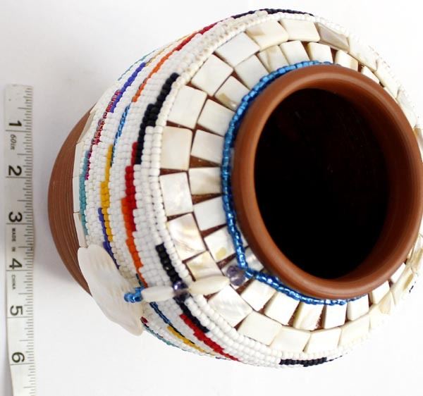 Pottery Vase Beadwork by KKT (Kathy Kills Thunder) 6x8'', Artist Bio: Kathleen Kills Thunder (her legal name) was born in 1947 in Seattle, WA. Her father, Ben Kills Thunder, was a Sioux Indian from the Fort Peck Indian Reservation in NE Montana and her mother was Spanish/Irish. Kathy has been painting and beading since she was six.