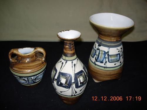 "Handpainted, Harsa-Israel" is written on each piece. The smallest piece is about 5.5" tall and 5.25" wide. The middle sized piece is about 8 3/4" tall and 4" wide. The largest piece is about 8 3/4" tall and 5 3/4" wide.