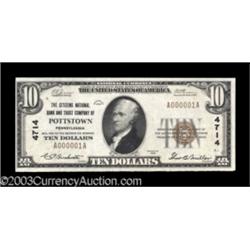 <TABLE cellSpacing=0 cellPadding=0 width="100%" bgColor=#000000 border=0><TBODY> <TR><TD width="100%"><TABLE cellSpacing=1 cellPadding=3 width="100%" border=0><TBODY><TR><TD width="100%" bgColor=#79735c><FONT face=arial color=#ffffff size=3><B>Description</B> </FONT></TD></TR><TR><TD width="100%" bgColor=#ffffff><FONT face=arial size=2><B>Pottstown, PA</B></I> - $10 1929 Ty. 1 <B>The Citizens NB & TC</B></I> Ch. # 4714<BR>The only serial number 1 example reported from this bank according to the new Kelly census. This A000001A note grades <B>Extremely Fine-About Uncirculated,</B></I> displaying just a couple of storage folds. (1,400-1,800 ) </FONT></TD></TR></TBODY></TABLE></TD></TR></TBODY></TABLE><BR><TABLE cellSpacing=0 cellPadding=0 width="100%" bgColor=#000000 border=0><TBODY><TR> Important notice: Heritage usually auctions material at the rate of 200-250 lots per hour. On some occasions eBay Live bid software or the Internet may not be able to keep up with the pace of the auction. We recommend placing a realistic absentee bid now as insurance to avoid disappointment. Occasionally the auctioneer may eliminate or reject an eBay Live bid, and the auctioneer may also reopen a lot after the close of the eBay live bidding (usually because we missed an audience bid), and may reject your bid even if it shows you as the winning bidder. By bidding via eBay Live, you agree that Heritage may award the lot to another bidder at its sole discretion under the circumstances described above or any other reasonable circumstances. Also please note that all Heritage lots purchased through eBay Live carry a 20% Buyer's Premium. Please make sure you read the Terms and Conditions before you bid.</TR></TBODY></TABLE>