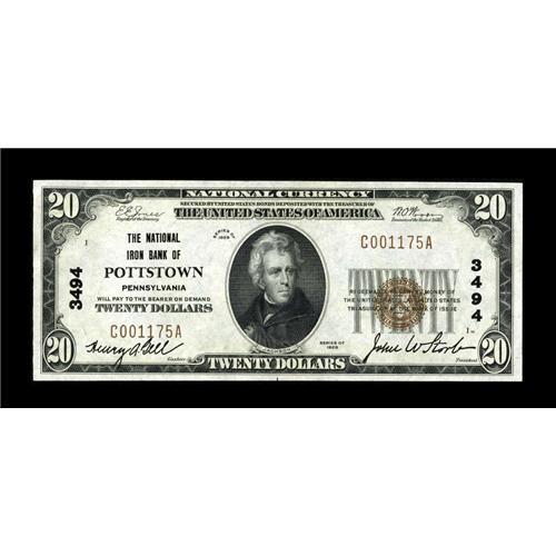 <B>Pottstown, PA</B></I> - $20 1929 Ty. 1 <B>The National Iron Bank</B></I> Ch. # 3494<BR>A well centered <B>Gem Crisp Uncirculated</B></I> with a better bank title. The paper surfaces are absolutely superb and this bright note should be viewed as a learning experience to see first hand what a truly original and unmolested note looks like.<BR><BR><b>Shipping:</b> Coin/Currency (<a target="_blank" href="http://www.heritageauctions.com/common/shipping.php">view shipping information</a>)