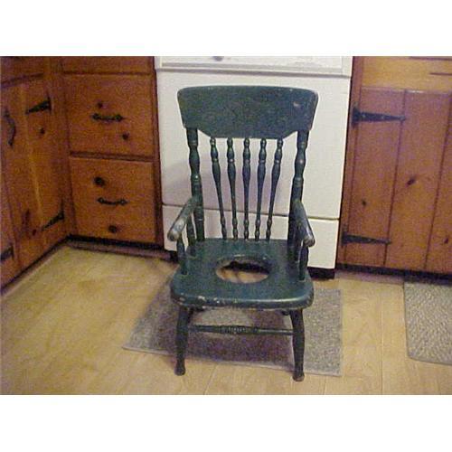 Potty Chair, Oak , pressed design back; 5 spindles, painted green; 13 X 14 X 27" tall, Excellent Collector's Piece.