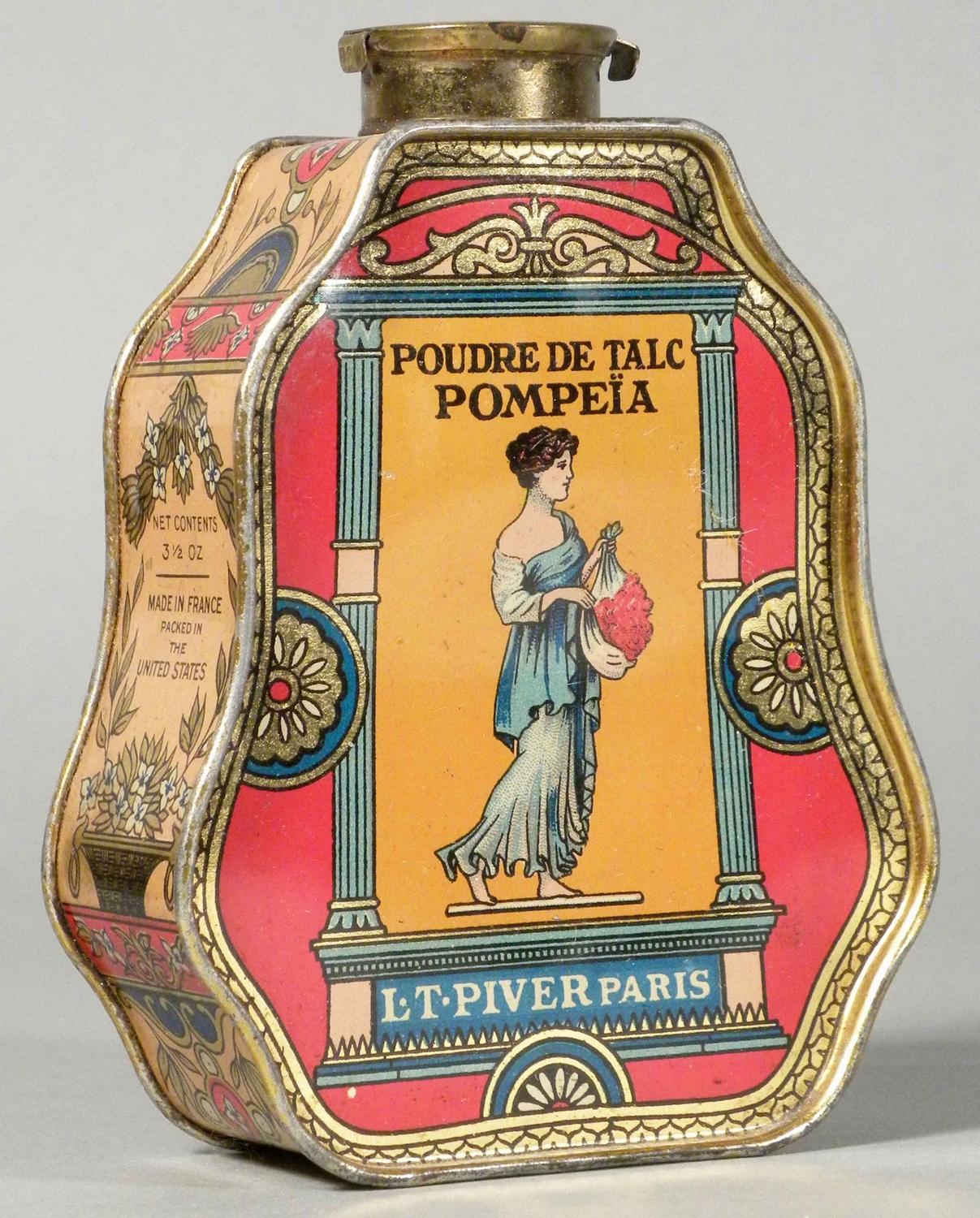 Poudre De Talc Pompeii Talc Tin. Made in France and packed in the United States. Excellent condition. 3 1/4 X 4 1/4 X 1 1/4 inches. Starting bid $20