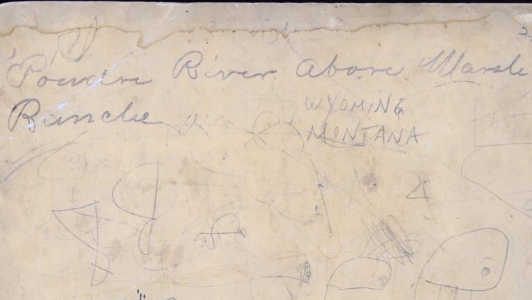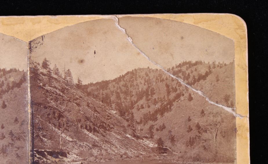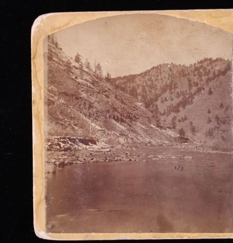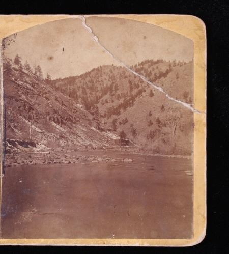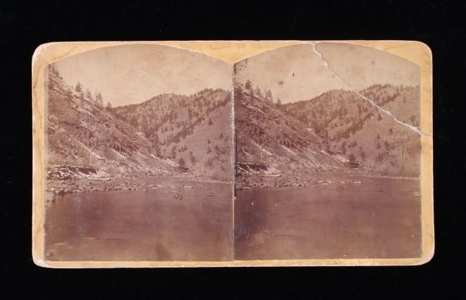Included in this lot is an original early 1900s side-by-side photograph of the Poudre River. This piece depicts two of the same photograph side-by-side of the Poudre River that is located in Fort Collins, Colorado. The photos show a rocky river surrounded by a slightly snowy hills. On the backside of the photographs is written "Poudre River" There are also some drawings in pencil on the backside on the photographs. This piece is in fair condition, with a tear on the top right of the photograph. This piece measures 7" by 4".