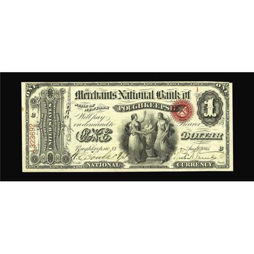 <B>Poughkeepsie, NY</B></I> - $1 Original Fr. 380 <B>The Merchants NB</B></I> Ch. # 1380<BR>This note last appeared in the 1979 NASCA sale where is was very conservatively graded and realized a then princely sum of $850. The days of acquiring a magnificent example as this at those prices are long gone. This lovely note bears the presence of two folds placed long ago with a touch of light handling. The classic pen signatures remain bold on very crisp surfaces that do not show their age. In terms of condition this <B>Extremely Fine-About Uncirculated</B></I> beauty ranks as one of the best Serial Number One Original Series notes for the state.