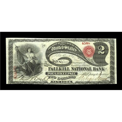 <B>Poughkeepsie, NY</B></I> - $2 Original Fr. 387 <B>The Fallkill NB</B></I> Ch. # 659<BR>This is an utterly original example with perfect paper, vivid colors,and incredible eye appeal. But for the close bottom margin, it would easily grade Gem Crisp Uncirculated or Superb Gem Uncirculated. We've conservatively graded it as <B>Crisp Uncirculated,</B></I> although we've seen lots worse examples receive the Choice designation. Expect to see a realization of around...