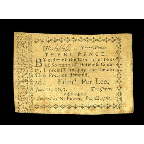 <B>Poughkeepsie, NY- Constitutional Society of Dutchess County</B></I> 3 Pence Jan. 11, 1791 Harris 3<BR>A scarce piece of early New York scrip. <B>Very Fine-Extremely Fine.</B></I>