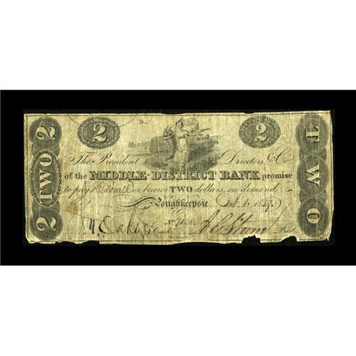 <B>Poughkeepsie, NY- Middle District Bank</B></I> $2 Oct. 1, 1827 UNL<BR>This denomination and design are unlisted for this issuer in the Haxby reference. <B>Fine,</B></I> with a few small chips out at the bottom.<BR><BR><b>Shipping:</b> Coins & Currency (<a target="_blank" href="http://www.heritageauctions.com/common/shipping.php">view shipping information</a>)