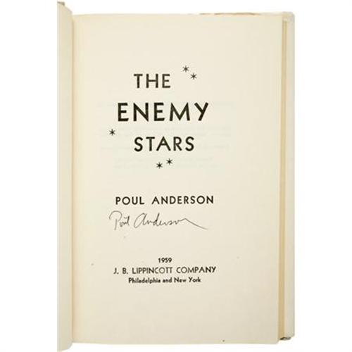 <B>Poul Anderson Signed: </B></I><B><I>The Enemy Stars</B></I></B></I>. (Philadelphia: J. B. Lippincott Company, 1959), first edition, 189 pages, grey boards, 12mo, dust jacket. Condition (book/ dj): very good/ very good.<BR><BR><b>Shipping:</b> Books & Catalogs (<a target="_blank" href="http://www.heritageauctions.com/common/shipping.php">view shipping information</a>)