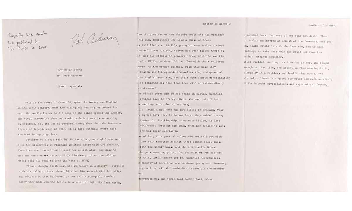 American author (1926–2001) best known for such fantasy and science fiction works as the Pyrotechnic League and Time Patrol series. Typed synopsis entitled Mother of Kings, 8.5 x 11, three pages, signed at the top of the first page in black ink, “Prospectus for a novel to be published by Tor Books in 2001.” In fine condition.