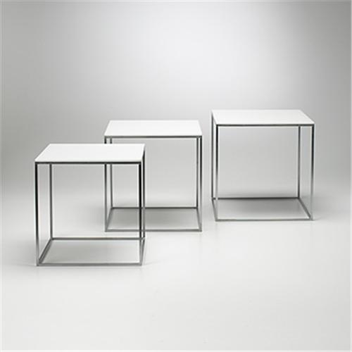 Poul Kjaerholm PK 71 tables, set of three E. Kold Christensen Denmark, 1957 matte chrome plated steel, acrylic 11.25"w x 11.25"d x 11.5"h Stamped: [Denmark] indicating early production by E. Kold Christensen. Literature: Poul Kjaerholm, Utzon, pg. 177