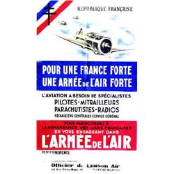 Pour une France Forte une Armée de l'Air Forte L'Aviation a besoin de spécialistes - Pilotes - Mitrailleurs - Parachutistes - Radios - Mécaniciens - Comptables - Service Général - Vous participez à la Renaissance des ailes françaises en vous engageant dans l'armée de l'air. - Pour tous renseignem "ents, s'adresser : Officier de Liaison Air 48 rue Victor Hugo Mont-de-Marsan" Delmas Bordeaux Aff. N.E. B.E. B + 610/910 € 108.5 x 63 cm 4000/5970 FF 520/770 $ GUERRE 39 - 45 / 1939 - 1945 WAR