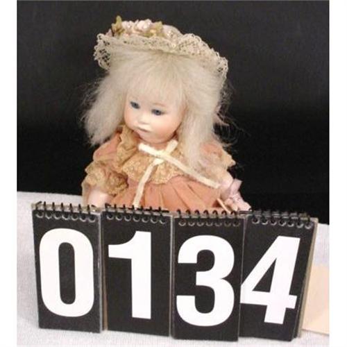 Pouty doll from "Yesterday and Today Doll Shoppe" in Searsport, Maine. Blonde hair with pink and white dress. Doll measures 10" x 5" x 2.5" and weighs 13 ounces. [81]
