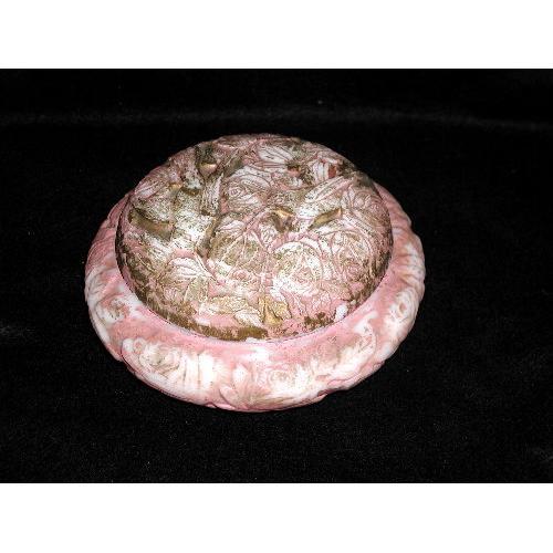Highly unusual painted milk glass powder bowl by Consolidated Glass Company has a rose motif covering the lid and bowl. A pair of birds rest atop the roses on the gilt lid. The bottom has been colored rose.In excellent condition,no cracks,chips or dings to either part.Shown on pg 34 of the Collectors Encylopedia of Milk Glass by Betty and Bill Newbound.