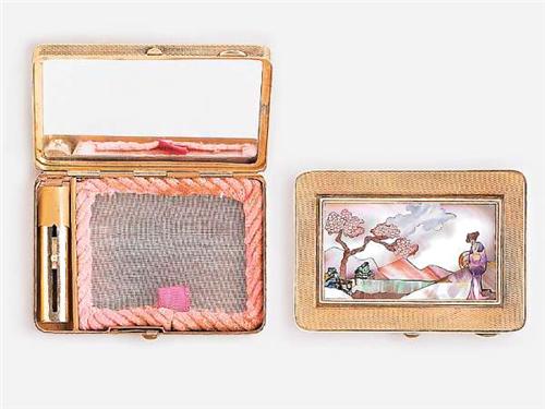 14 K gold, rectangular form with rounded corners, hinged cover with press-stud on the shorter side, guilloche decoration, on the cover in applied frame there are different colour mother-of-pearl elements in mosaic form (a Japanese lady wearing a kimono wa