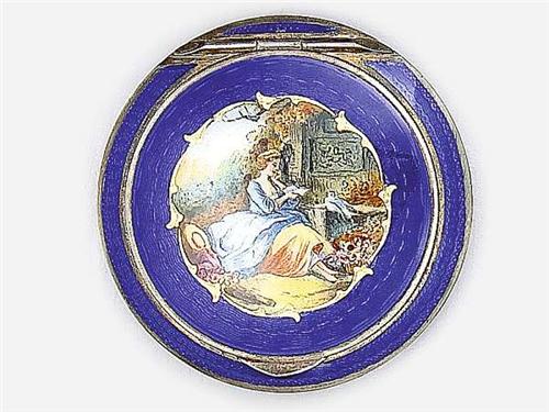 Silver, 45 g, with mirror inside. On the surface royal blue enamel, on the cover engraved and gilt frame, colour enamel paint depicting a woman reading a love letter. Marked: Made in Austria, 20th century, Sterling Silver. Diameter: 5 cm