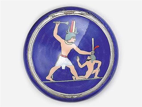 Silver, gross weight: 88 g, gilt interior with mirror. On the surface there is colour enamel decoration depicting an Egyptian scene. Marked: import mark from London 1925, Sterling Standard 925 fineness. Diameter: 7 cm