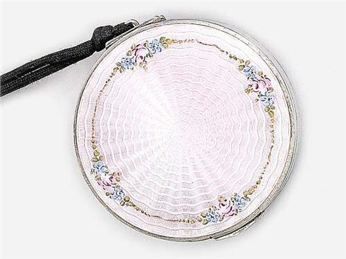 Silver, gross weight: 115 g, gilt interior. Guilloche decoration on the surface, pink translucid enamel with coloured flowers. Marked: U. S. A., Sterling sign, 20th century. Diameter: 6.5 cm