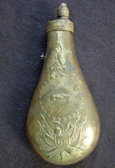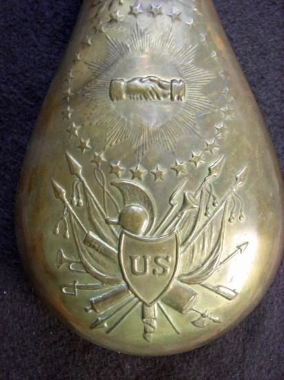 Powder Flask depicting Eagle hand shake flags and arms Scene 221617GG