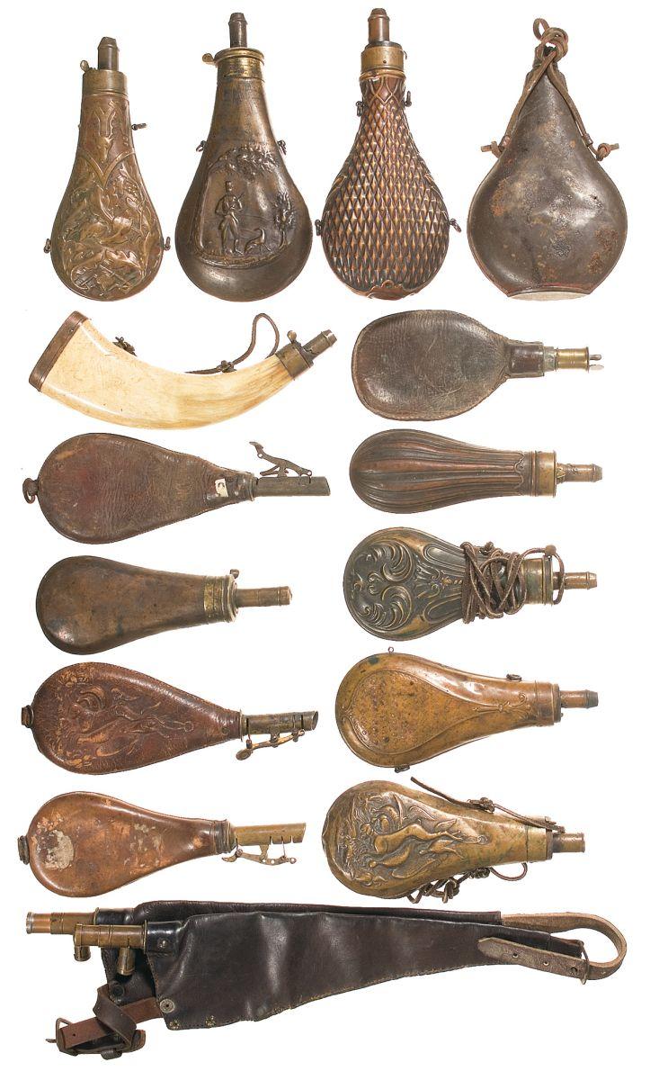 19th century powder flasks (1 horn, 7 with various designs, 2 plain), and shot pouches (3 plain, 2 with hunting scene). Good.